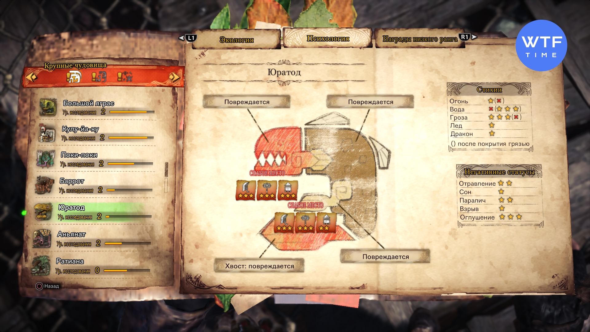 Это ихтиовиверна, которая ловит добычу в грязи и враждует за территорию с Барротом. Найти Юратода можно в болотах на юге Дикогорья. У него тоже есть грязевой панцирь, плотно покрывающий все тело. Этот панцирь уязвим к водной стихии, но сбить его можно при желании любым оружием. После этого монстр станет уязвим к стихии грозы.