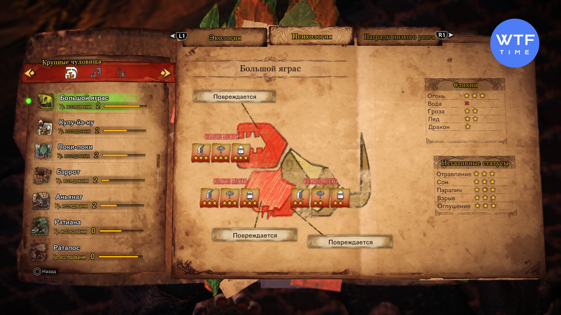 Самые слабые места Большого яграса - голова и брюхо. Особенно если это брюхо набито до отказа. Цельтесь туда, это значительно ослабит чудище. Они очень уязвимы к огню и ко всем имеющимся негативным статусам. Имеют хорошую защиту к урону от водной стихии.