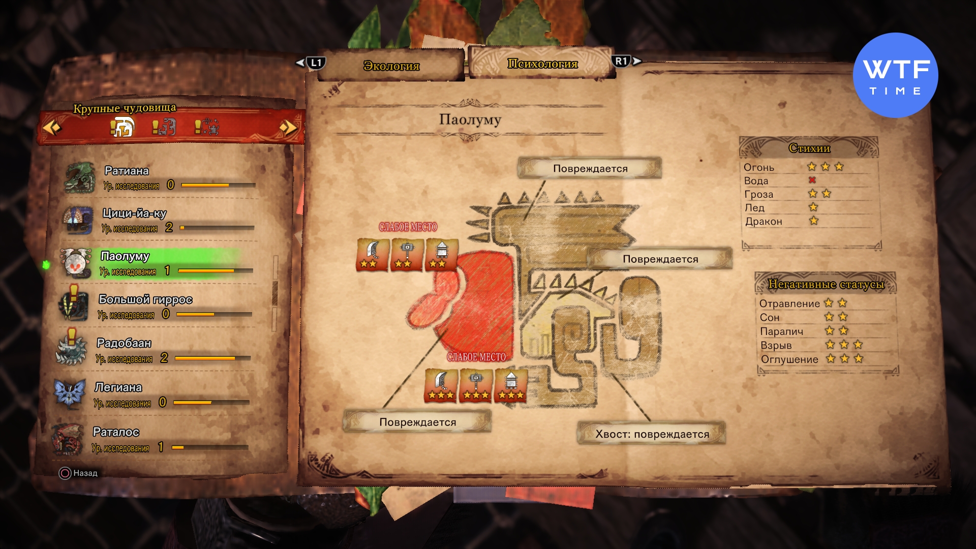 Берегитесь хвоста этого чудища, от него может сильно прилететь. Самое слабое место этой виверны - шея. Паолуму очень восприимчива к огню и имеет иммунитет к водной стихии. Также монстр хорошо восприимчив к взрывам и оглушению. В данном случае хорошей идеей будет взять палку подлиннее.