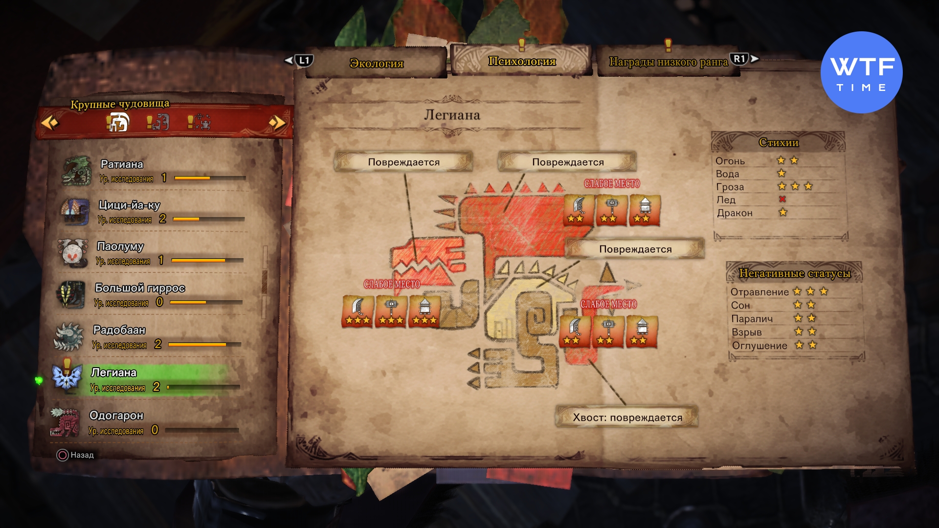 Брать короткое или медленное оружие - гиблая затея. Нам больше всего приглянулась Глефа насекомых. Благодаря её очень удобно подпрыгивать и бить монстра по голове и крыльям, оглушая и не давая в очередной раз улететь. Легиана очень уязвима к стихии грозы, поэтому в глефе мы прокачали ветку Тоби-кадачи. А еще она отлично травится, так что у палико и кинсекта стоит выбрать соответствующие эффекты.