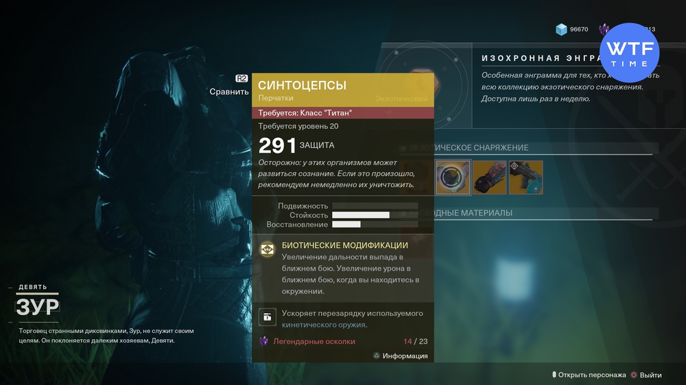 - Синтоцепсы - это перчатки, которые подойдут Титанам, предпочитающим воевать врукопашную. Они увеличивают дальность выпада в ближнем бою, а так же увеличивают его урон, когда вы находитесь в окружении. Модификатор ускоряет перезарядку используемого кинетического оружия.