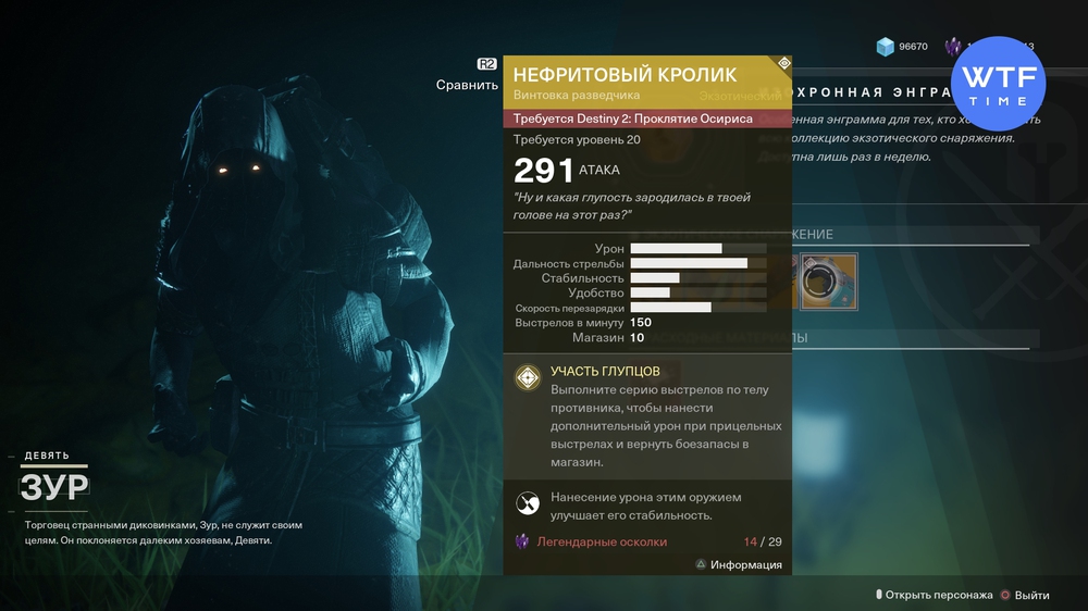 - Нефритовый кролик - это кинетическая винтовка разведчика, которая подойдет для любого класса персонажей. Для её использования понадобится дополнение Проклятие Осириса. С этим оружием вы сможете выполнить серию выстрелов по телу противника, чтобы нанести дополнительный урон при прицельных выстрелах и вернуть боезапасы в магазин. Благодаря модификатору нанесение урона этим оружием будет повышать стабильность.