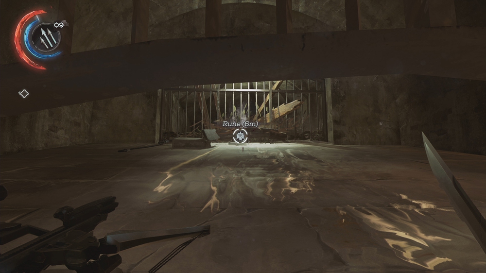 Там вы увидите решетку, а за ней - руну. Ее удерживают доски. Чтобы их разбить, нужно выстрелить. Целиться при этом лучше в руну. Когда доски перестанут ее держать, она сама к вам выплывет: