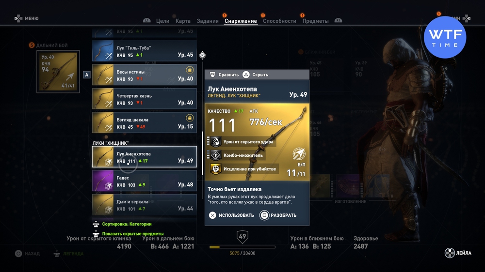 Разломав деревянную решетку, внутри мы нашли сундук с легендарным предметом. У нас это был лук-хищник Аменхотепа. Уровень предмета будет соответствовать уровню вашего персонажа. В качестве бонуса за использование этого оружия Байек будет восстанавливать 15% здоровья после убийства соперника.