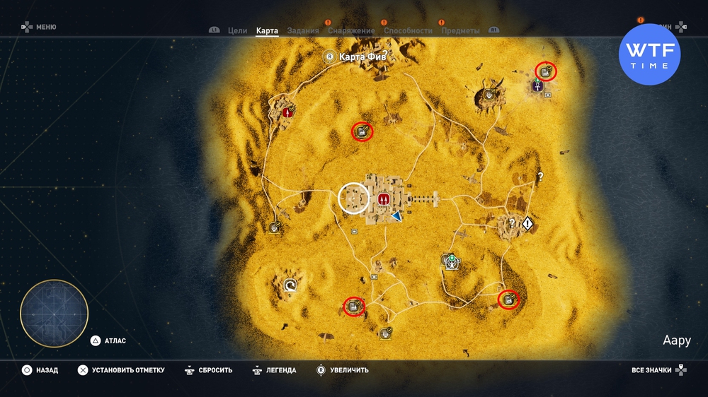 Чтобы получить текст загадки Нефертити в свое распоряжение, вам придется для начала изучить надписи на четырех стелах. Все они находятся в Аару, так что это недолго. Способностей Сену хватит, чтобы обозначить для вас точное место поисков в области. На карте ниже мы отметили все нужные места красным кругом.