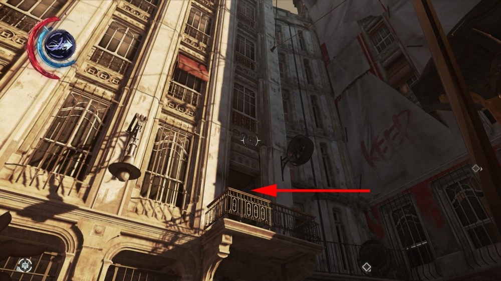 Руна 5: Эта руна расположена в верхней части квартала Авента. Вам нужно найти красный дом с уже знакомыми буквами KEEP OUT! на нем (как появитесь в локации, посмотрите налево). Прямо напротив этой надписи есть балкончик, куда нам и нужно забраться: