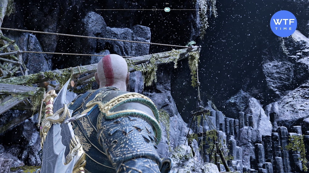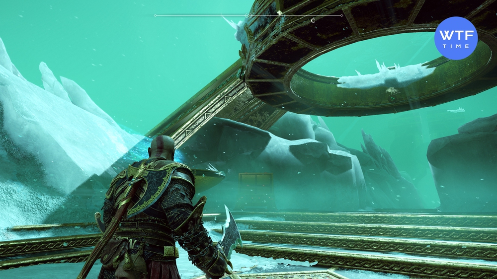 - Спускайтесь вниз на лифте. Впереди вы увидите две круговые лестницы, ведущие наверх к сундуку. Ворон Одина сидит прямо над ним на карнизе.