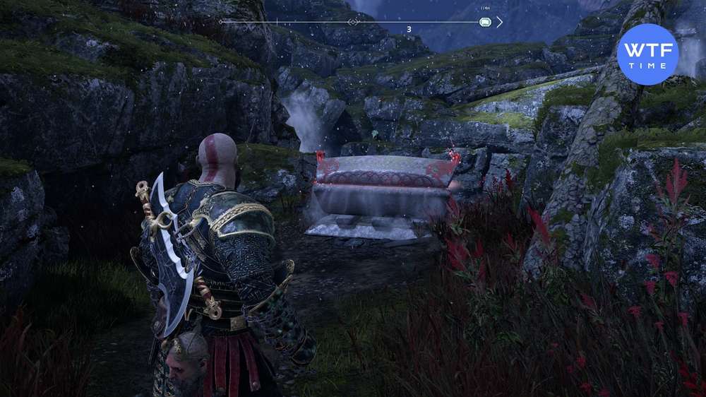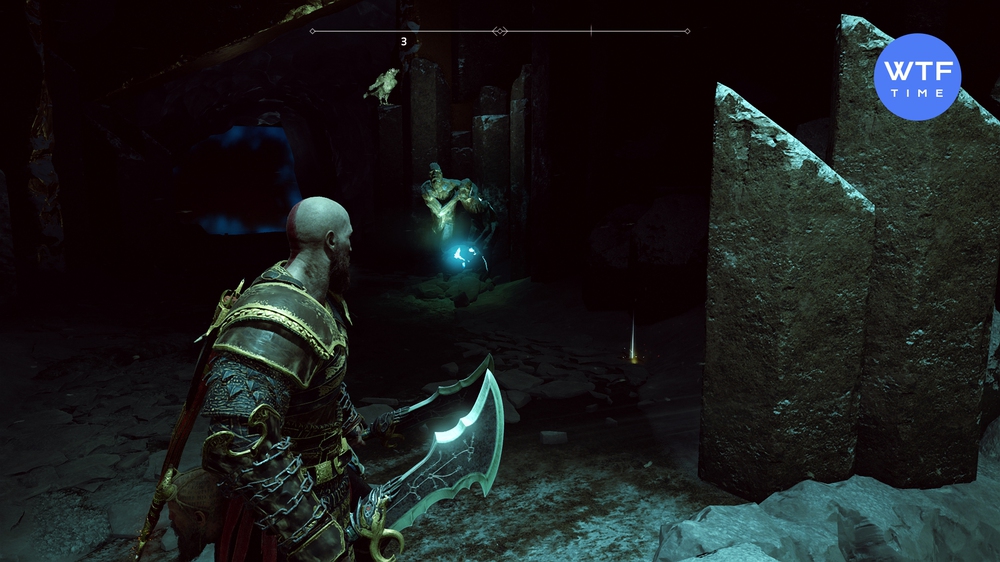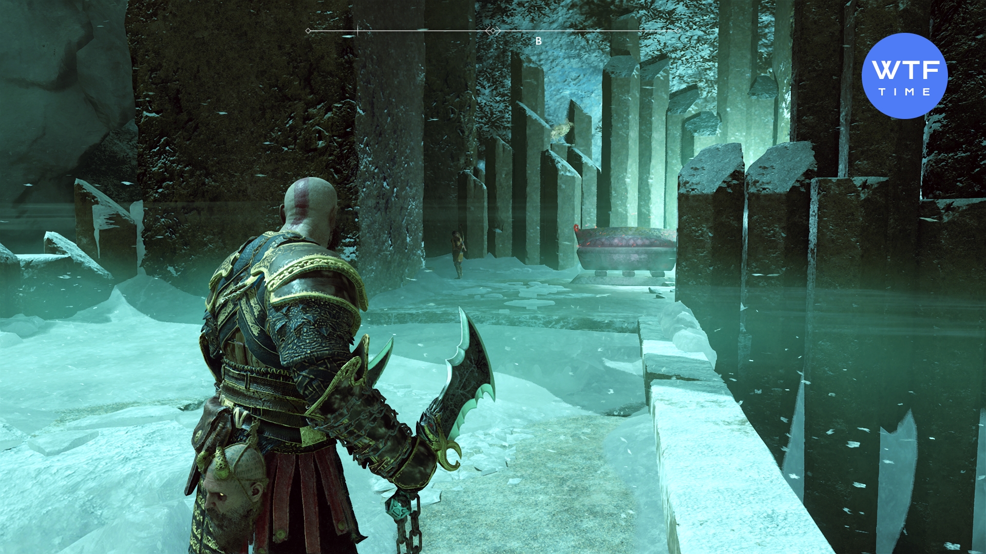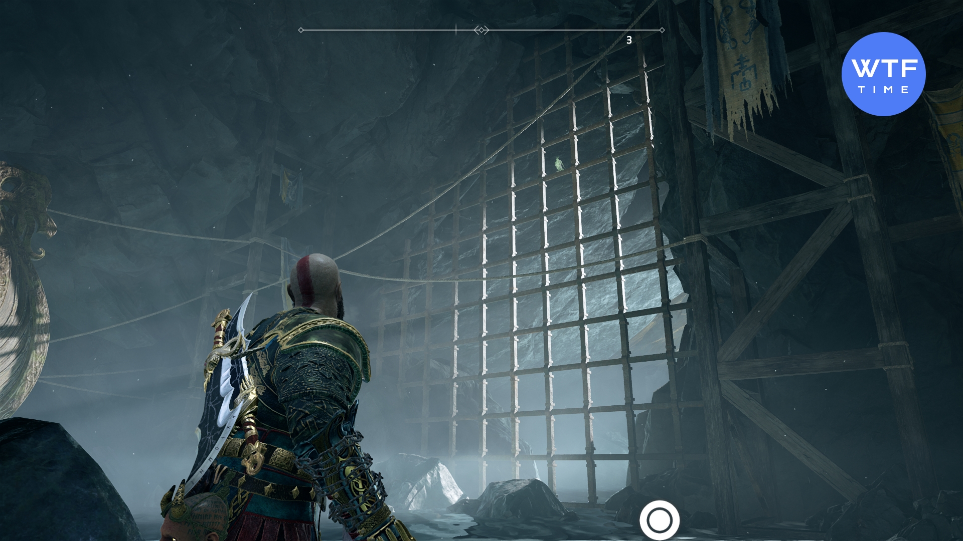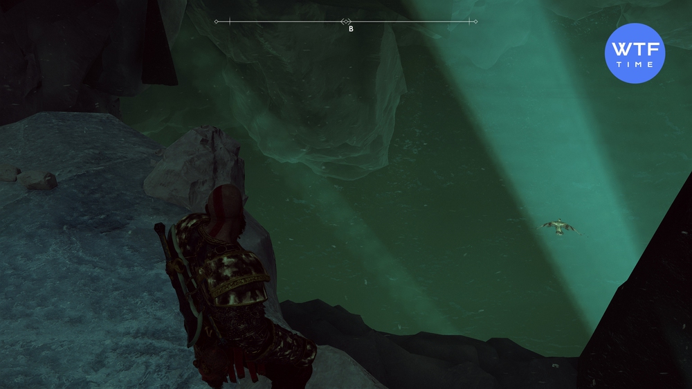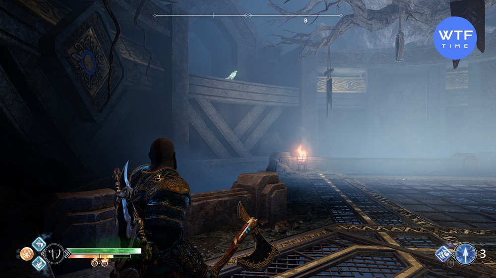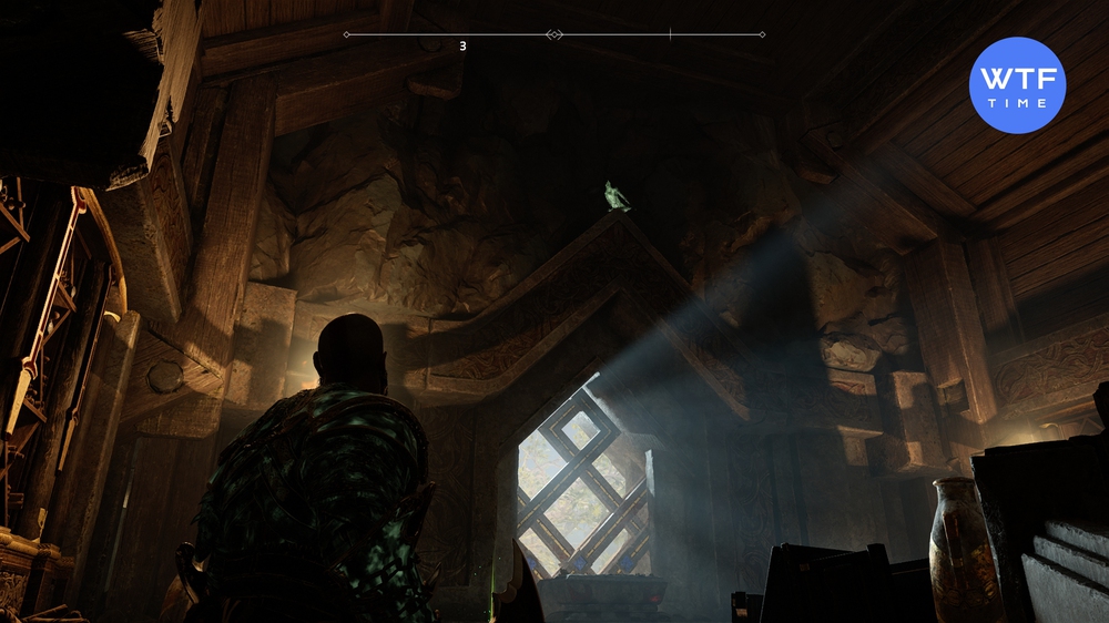 - Вернитесь к главной двери, ведущей в тронный зал. Вам нужно зайти внутрь, пройти немного вперед, а затем свернуть направо. Там вы увидите святилище йотунов, от которого нужно свернуть налево. В следующей комнате через дыру в потолке будет литься солнечный свет. Если присмотреться, там можно заметить птицу.