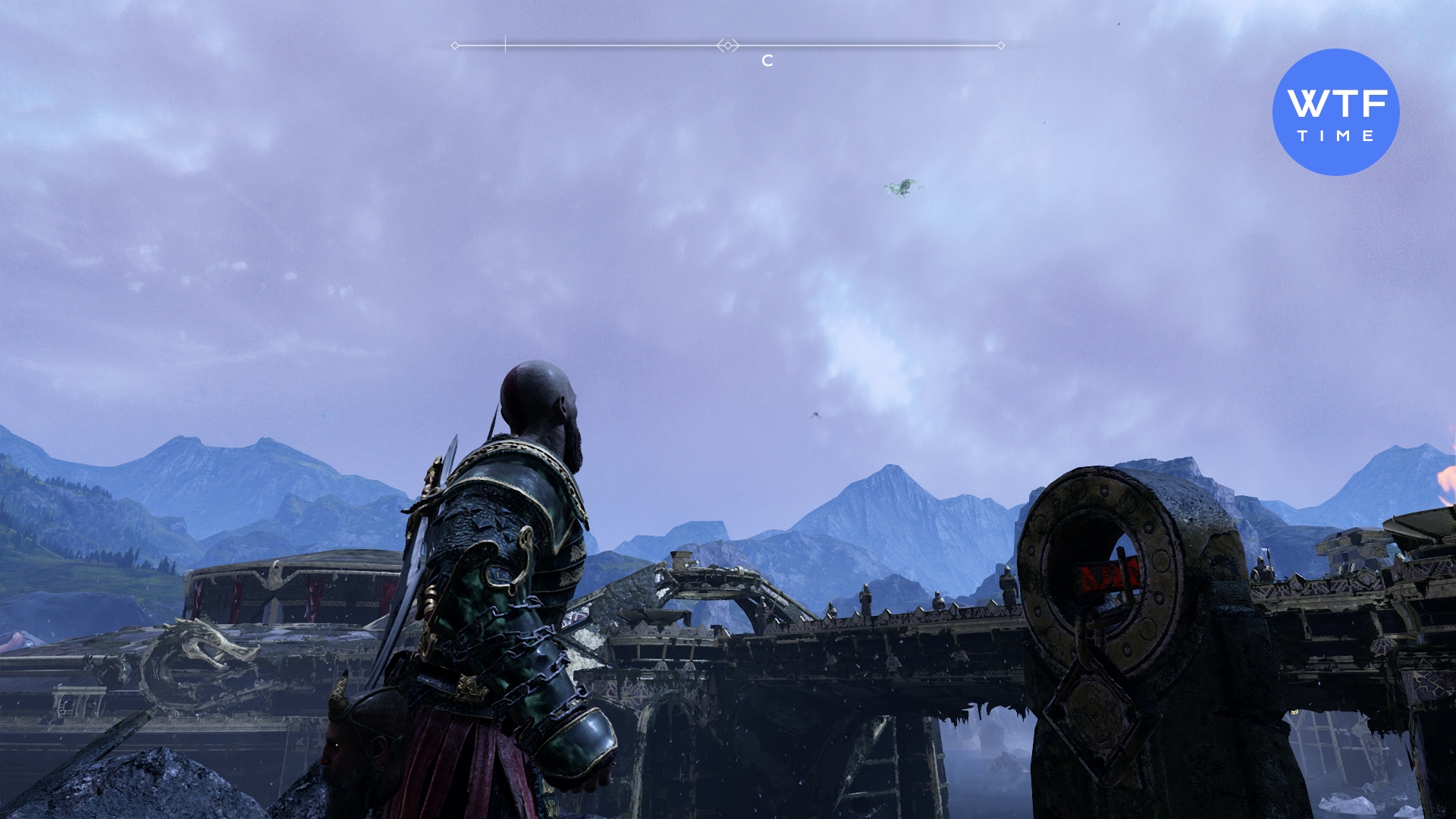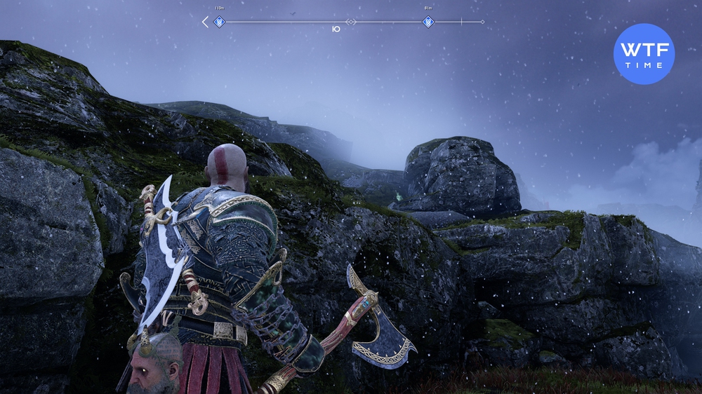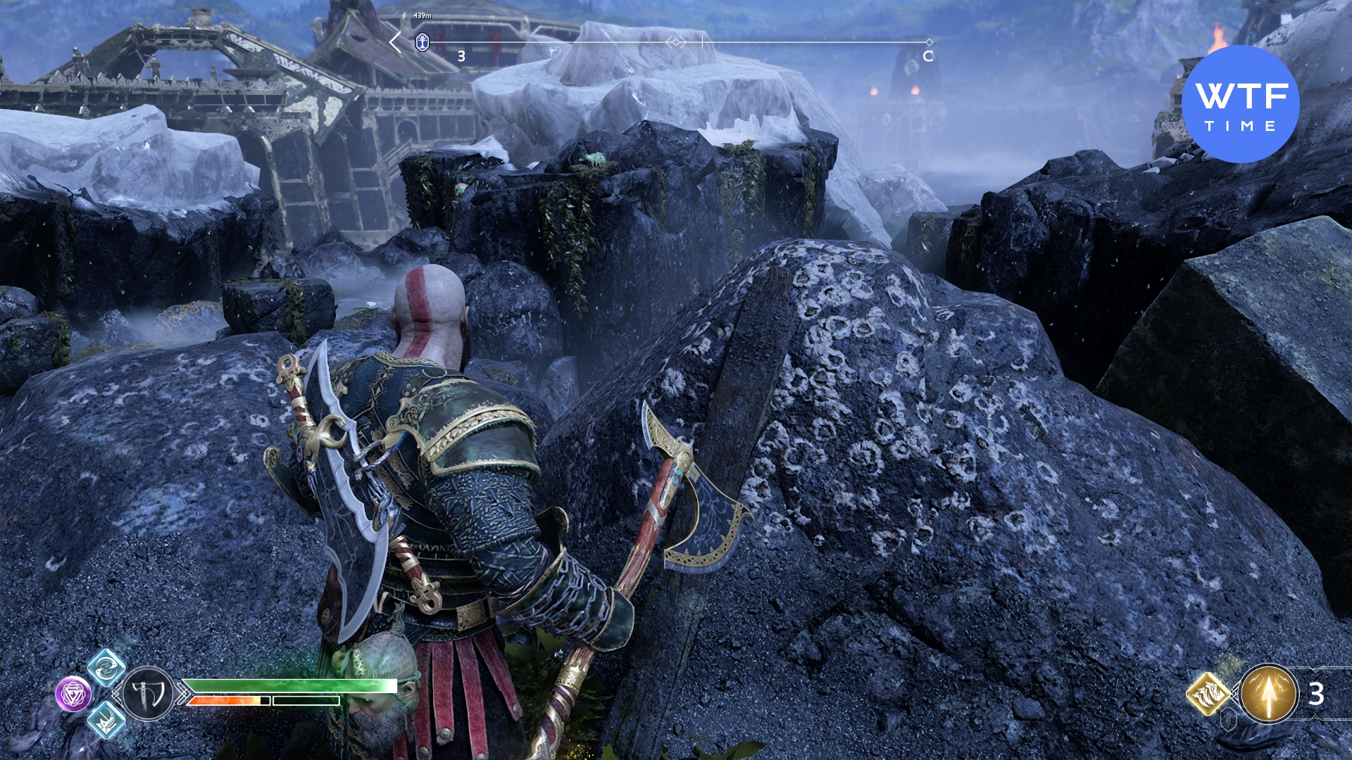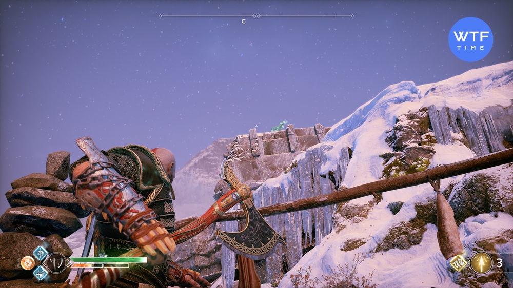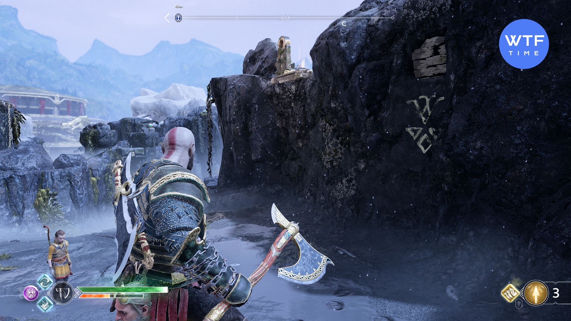 - Пройдите сквозь мистические врата "Каменщик: финал" и посмотрите налево. Птица сидит вдалеке на камнях. Чтобы попасть, цельтесь топором выше.