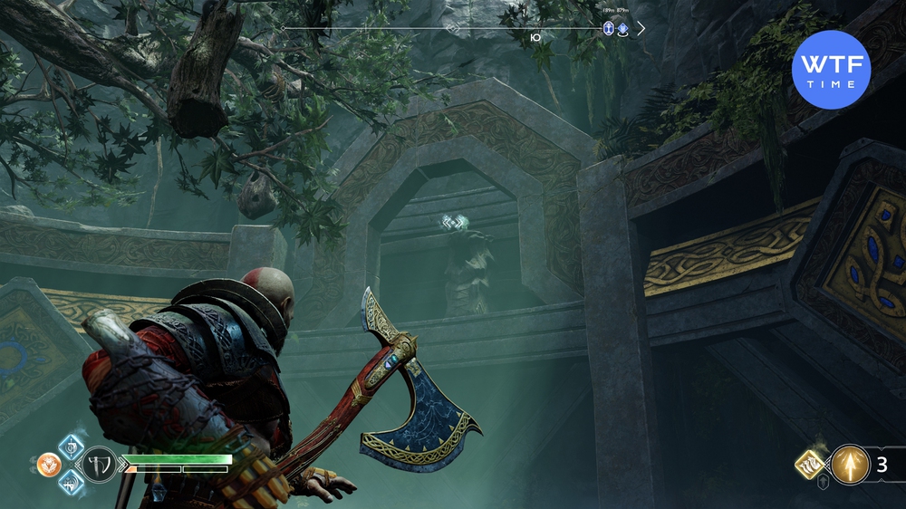 - Последний ворон ждет вас внутри тайной комнаты этого региона (подробнее тут). Попасть в нее можно из этого же зала с колесом, если после входа держаться правее. Птица сидит на карнизе внутри помещения, где мы били валькирию.