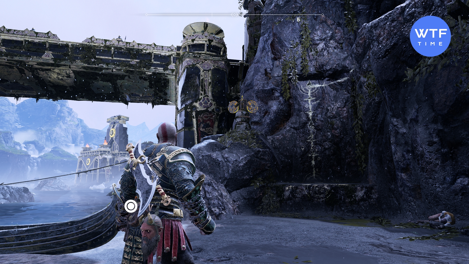 Несмотря на то, что трекер засчитывает эту птицу в локации Совет валькирий, причалить нам нужно к башне Альвхейма с левой стороны. Это к северо-востоку от храма Тюра на Озере Девяти. Ворон сидит на верхушке статуи гребца. Чтобы было проще до него достать, сначала заберитесь на каменный уступ.