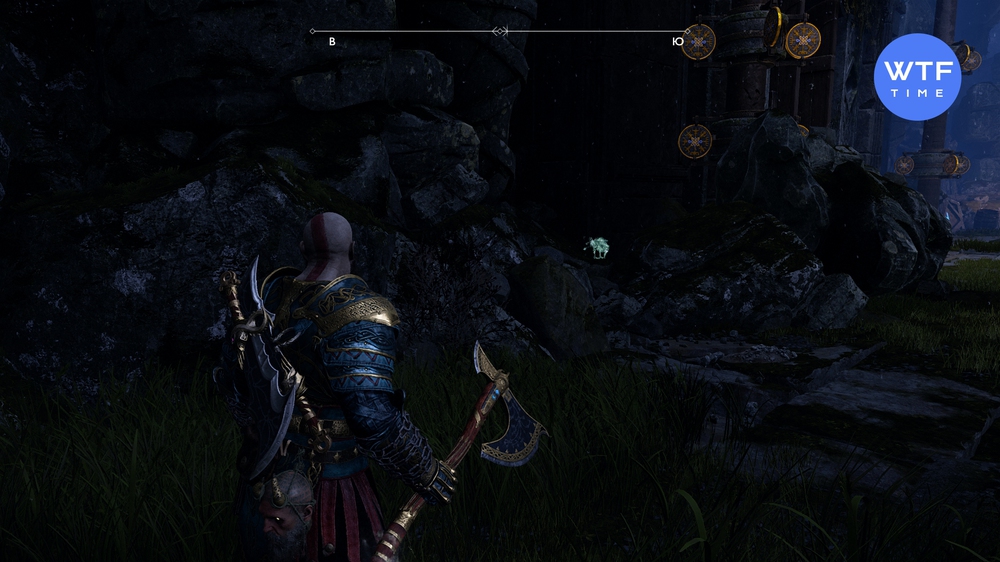 - Последний ворон в этой локации прячется среди камней слева от ворот, запертых на четыре руны. Вам нужно подойти вплотную к легендарной метке и стать к ней спиной, тогда птицу станет видно.