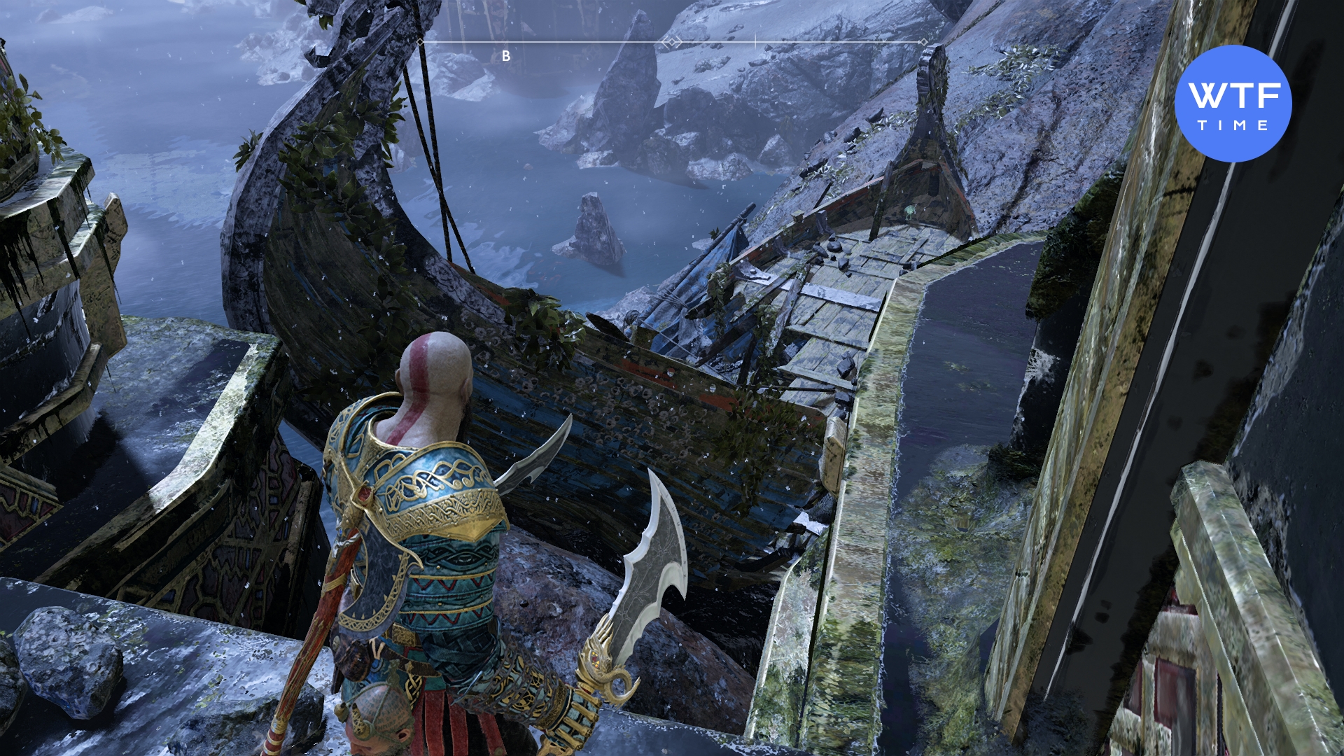 - Вторую птицу в этой локации можно найти внутри тайной комнаты Альвхейма (подробнее тут). Чтобы найти эту комнату, просто пройдите немного вглубь берега от предыдущей точки. Ворон сидит в зале, где мы сражаемся с валькирией. Вам нужно посмотреть на карниз слева сверху от входа.