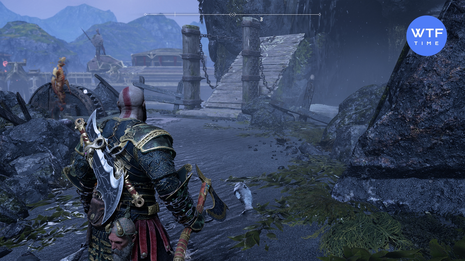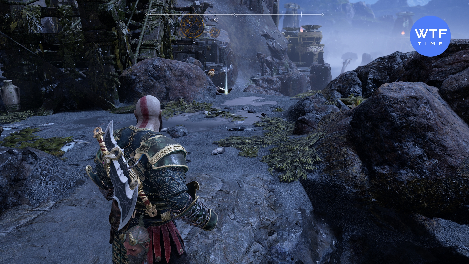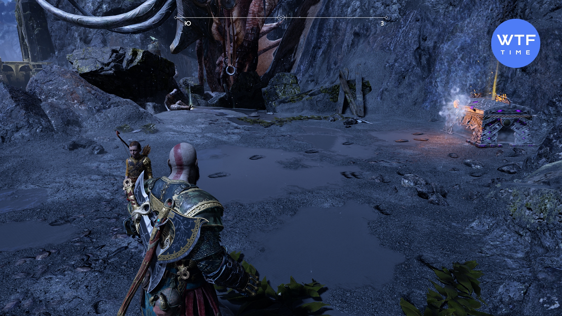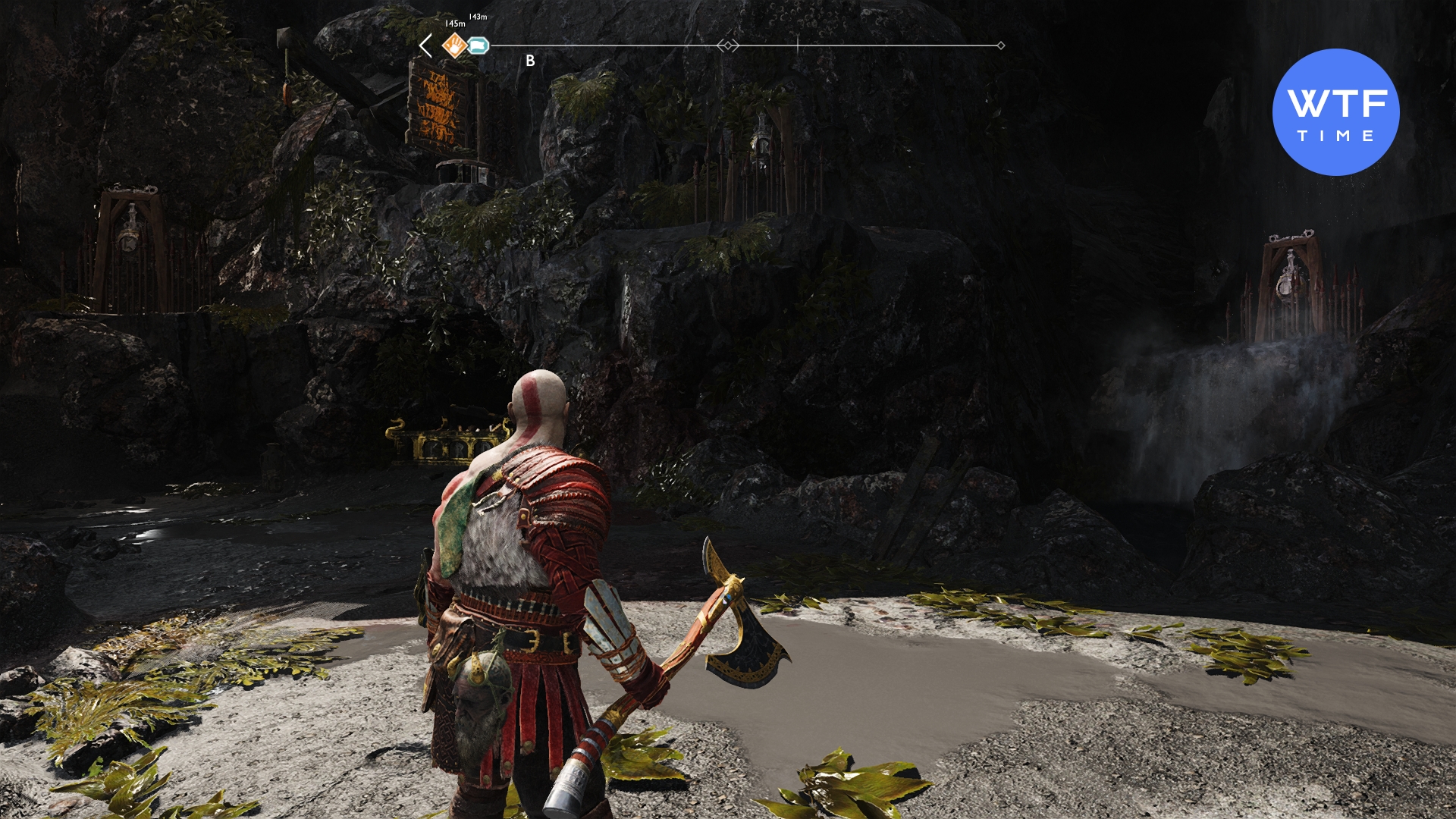 - Скалы ворона - это небольшая локация к юго-востоку от храма Тюра. Вам нужно продвигаться вглубь, пока не доберетесь до места с телом огромного великана. За ним есть цепь, её видно на нашем скриншоте. Справа от цепи есть небольшая деревянная стенка, которую можно сломать топором. Подсадите Атрея и он сбросит для вас цепь. Наверху вы найдете последний артефакт из набора.
