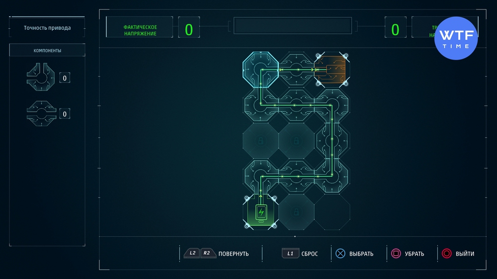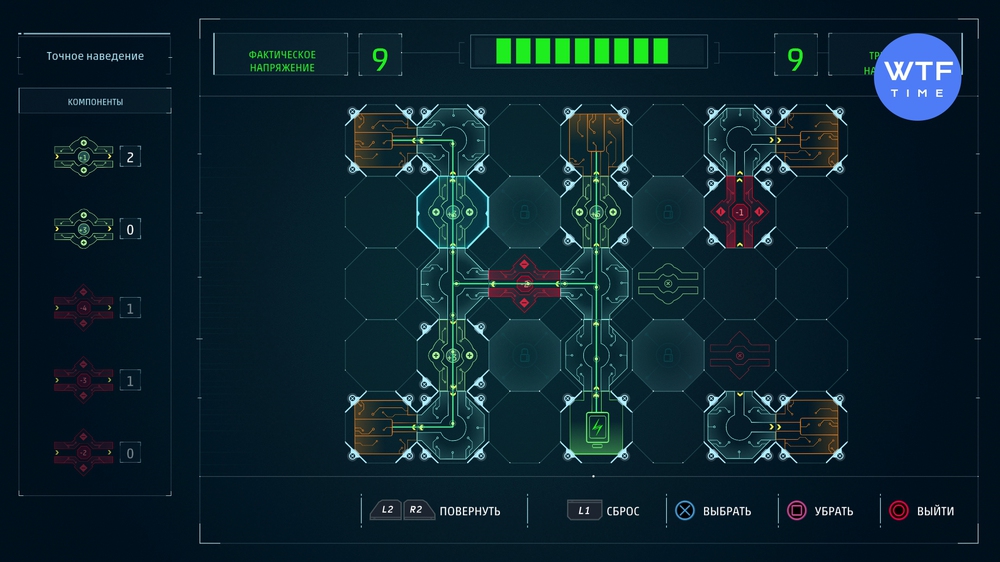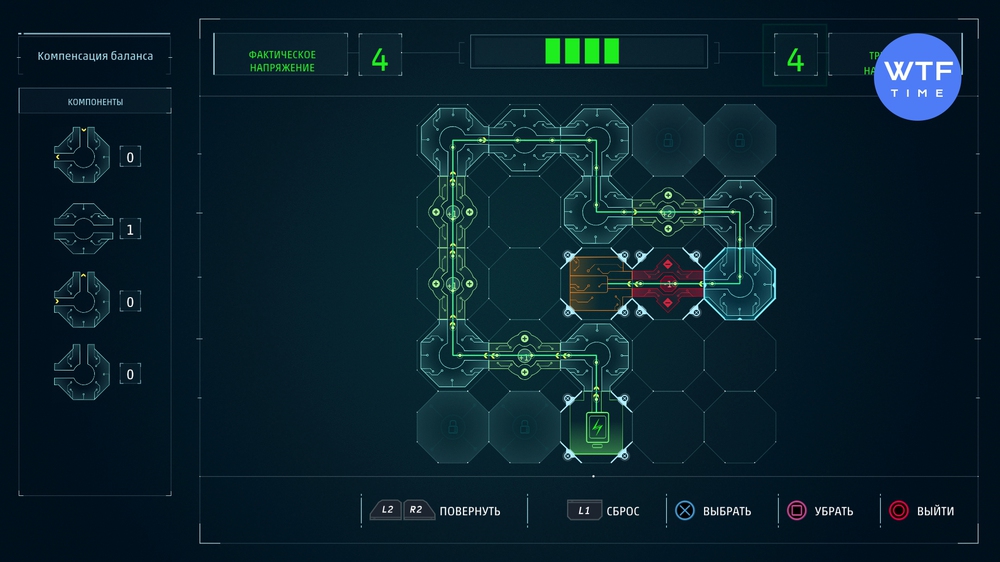 На этот раз задачка чуть усложняется. Помимо того, чтобы просто направить зеленый поток в нужном направлении, нужно собрать еще и необходимое количество напряжения. Обратите внимание, что у зеленой детали есть маленькие стрелочки по краям. Нужно повернуть её так, чтобы она верно направляла поток.