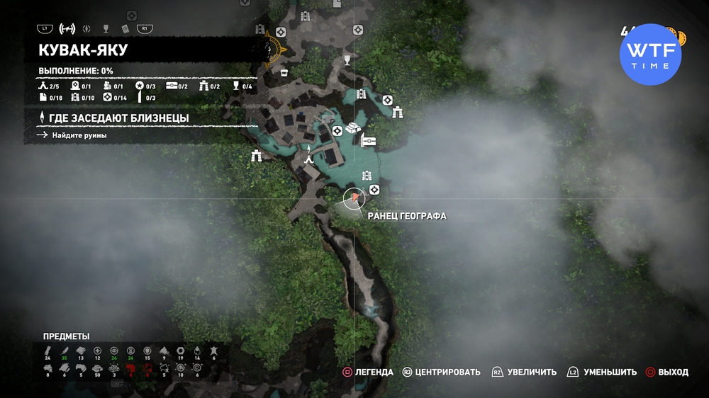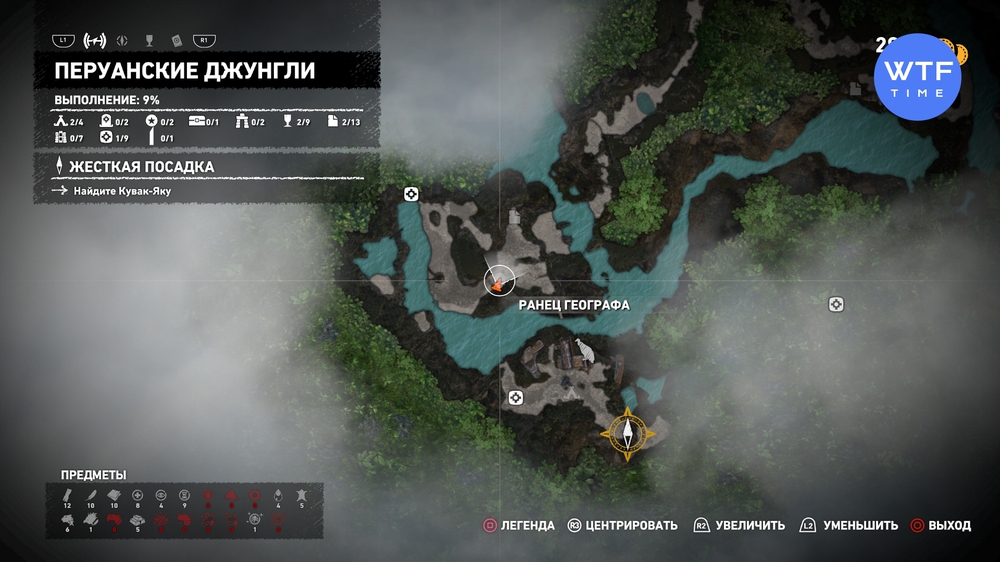 - В южной части Кувак-Яку есть базовый лагерь "Скалы в джунглях". Добраться туда можно только со стороны озера. Ранец географа лежит неподалеку от костра.