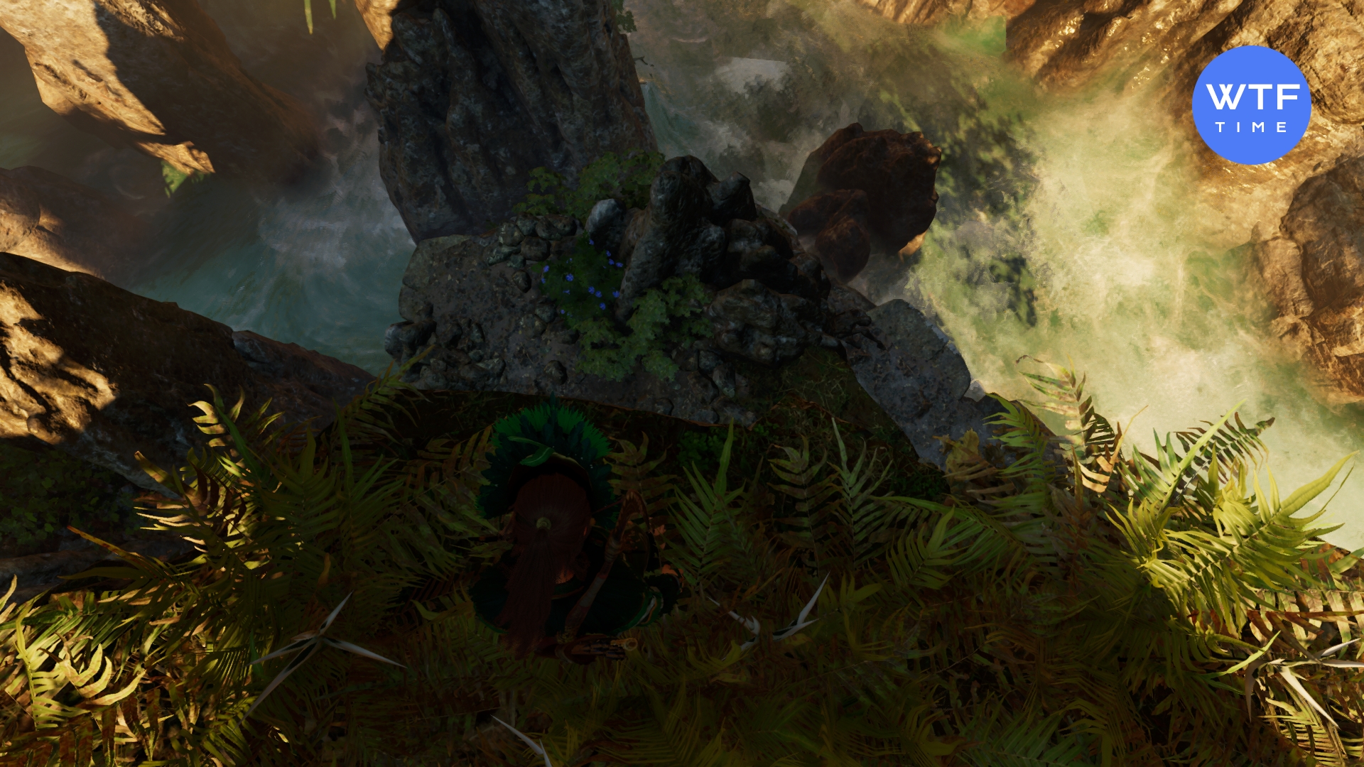 Есть два способа его забрать: пробраться длинным путем по скалам вокруг или спрыгнуть сверху. Второй способ быстрее проще. Вам нужно найти место сразу перед началом второго моста и посмотреть вниз с левой стороны. Видите кустик с голубыми цветами? Вам туда, а потом еще немного вниз (см. скриншот 2).