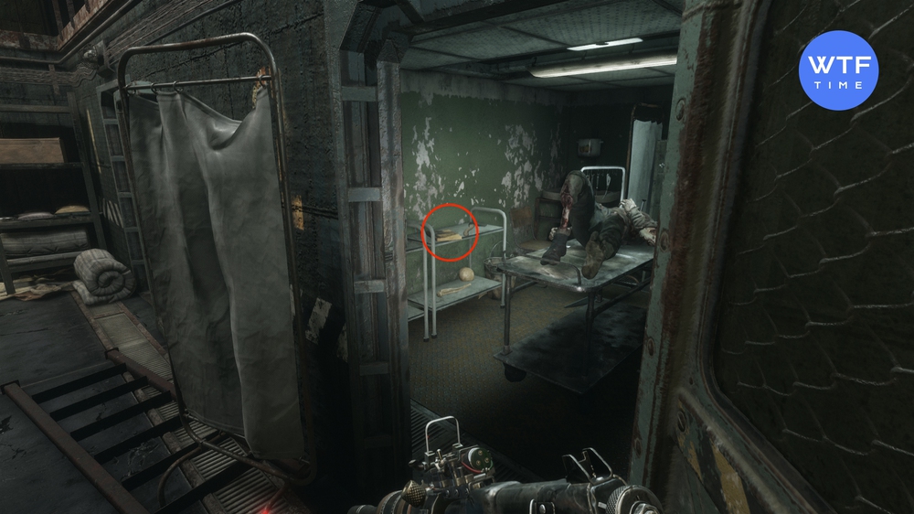 - Дневник №4 - после встречи с местным боссом вы попадете в коридор, в который выходят несколько небольших комнатушек. В одной из них на кушетке лежит тело без головы. "Дневник офицера 1" можно найти на столике рядом.