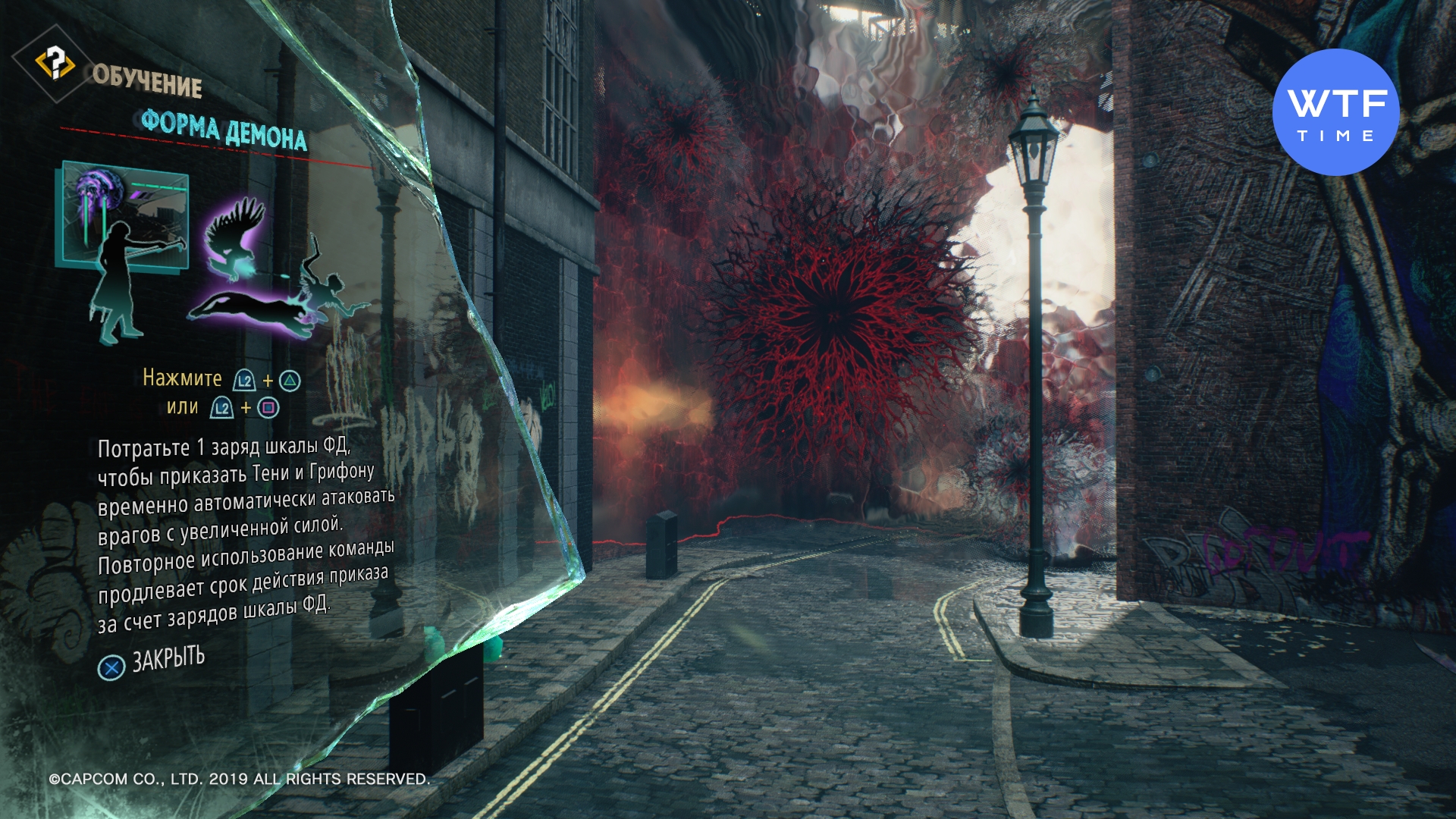 - Идите по сюжету, пока не окажетесь у здания с огромным граффити. В этот момент у вас должно всплыть обучение по форме демонов. Вместо того, чтобы опробовать новый навык, призовите Кошмара. Он появится, проломив у здания стену. За этой стеной вы найдете очередной синий осколок. Кроме того, на первом этаже этого же здания есть проход, ведущий во дворик. Идите туда и заберите детеныша Нидхегга.