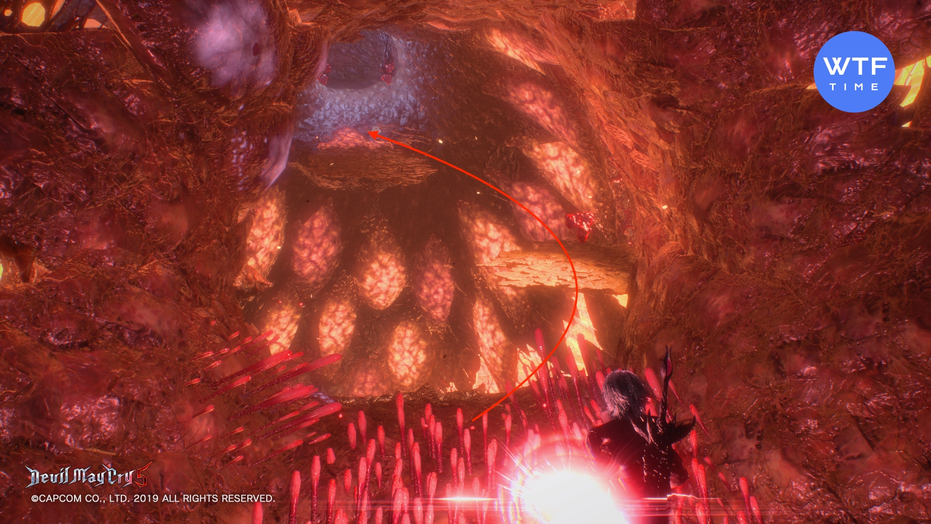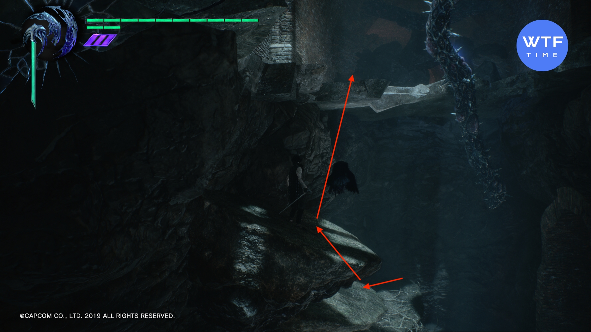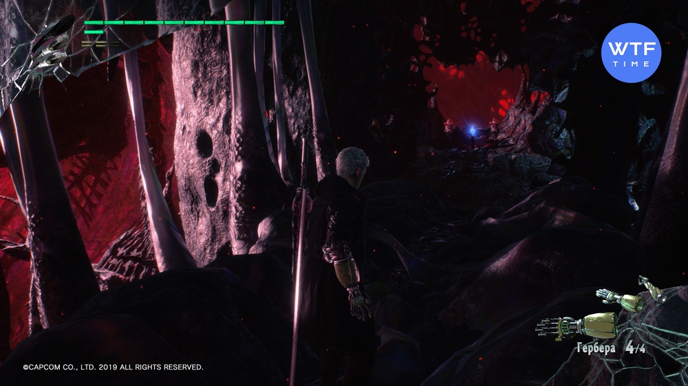 - Доберитесь до места, где вы сражаетесь с Адскими пиромантами (летающие огненные монстры) и еще одним бронированным чудищем. Это сюжетный бой, его нельзя пропустить. В следующем зале быстро запрыгните на разрушающуюся платформу справа, а с нее - в синюю арку. Идите вперед и снова спрыгните вниз, затем сразитесь с парочкой бронированных чудищ. После боя вам нужно снова спуститься, после чего вы увидите синюю сферу. Чтобы допрыгнуть до неё, включите стиль Обманщик и экипируйте мотоцикл. Затем выполните следующую комбинацию: двойной прыжок (2 раза Х), атака мотоциклом шесть раз (6 раз треугольник), прием стиля Обманщик (1 раз круг).