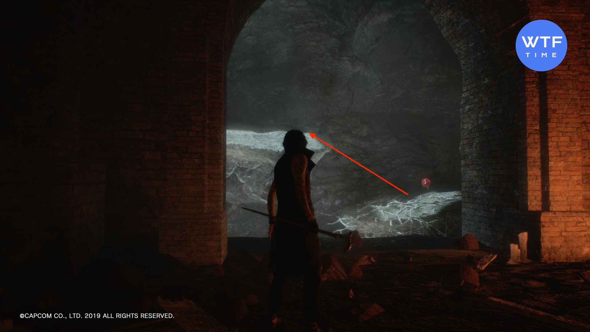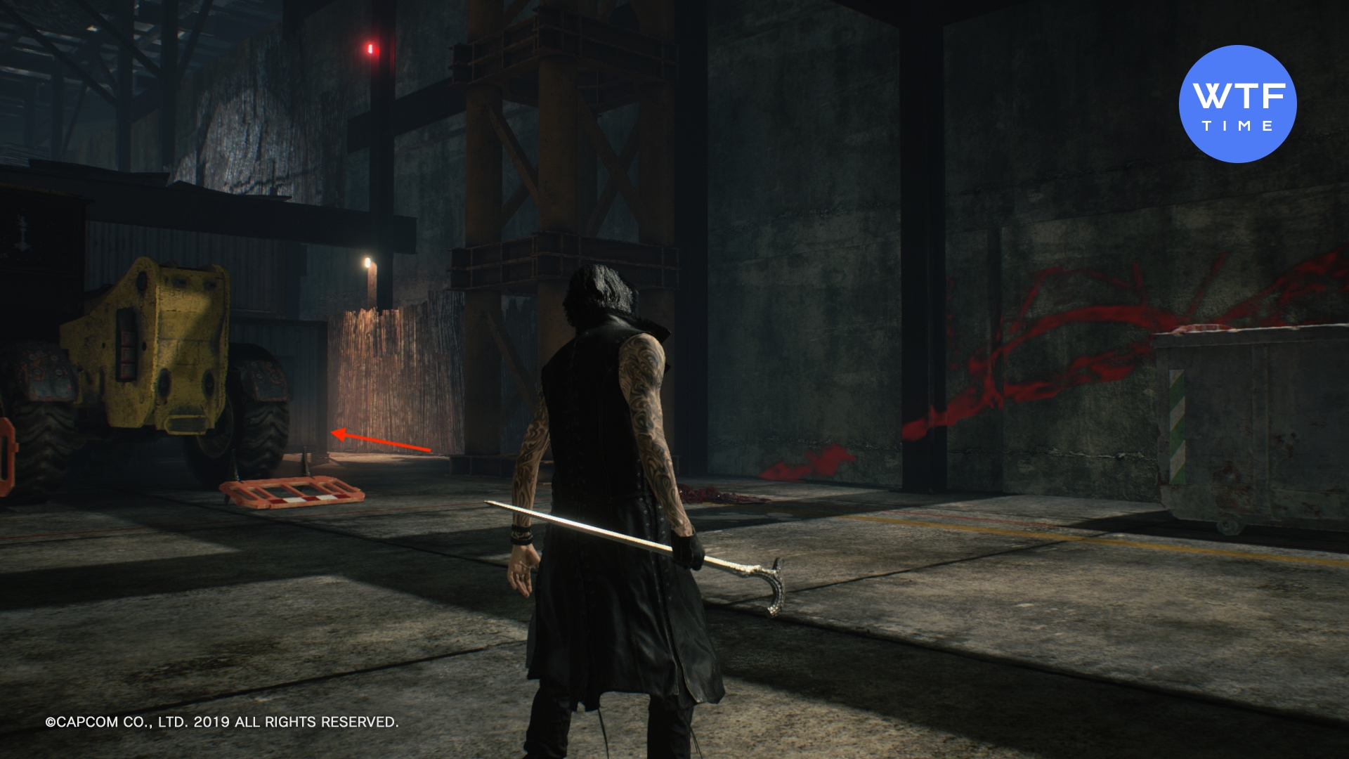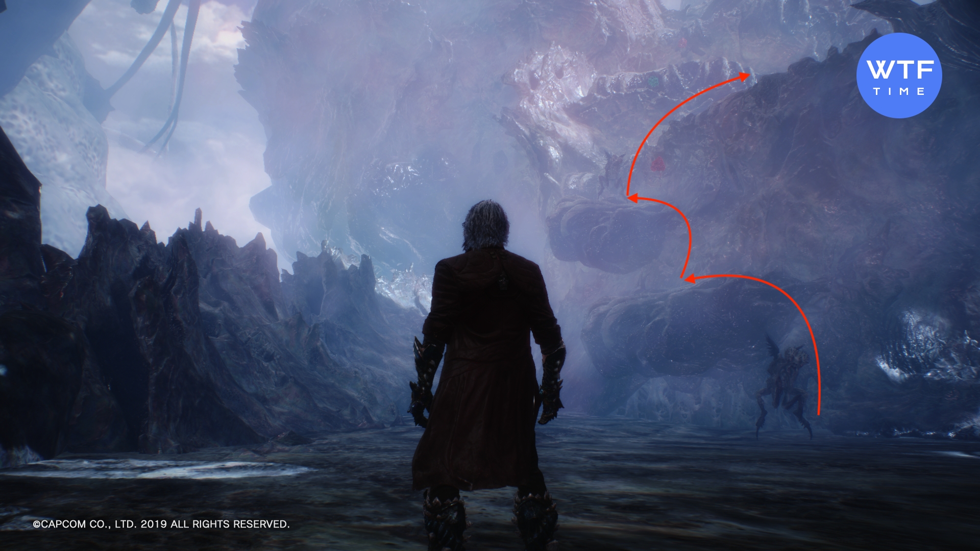 - Доберитесь до места, где вы сражаетесь с Адскими пиромантами (летающие огненные монстры) и еще одним бронированным чудищем. Это сюжетный бой, его нельзя пропустить. В следующем зале быстро запрыгните на разрушающуюся платформу справа, а с нее - в синюю арку. Идите вперед и снова спрыгните вниз, затем сразитесь с парочкой бронированных чудищ. После боя вам нужно снова спуститься, после чего вы увидите синюю сферу. Чтобы допрыгнуть до неё, включите стиль Обманщик и экипируйте мотоцикл. Затем выполните следующую комбинацию: двойной прыжок (2 раза Х), атака мотоциклом шесть раз (6 раз треугольник), прием стиля Обманщик (1 раз круг).