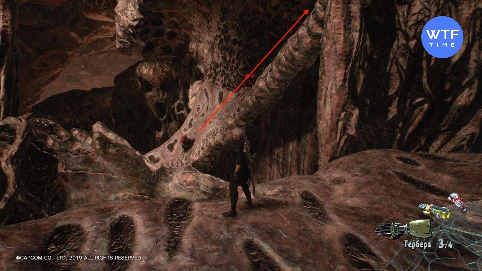 - Доберитесь до первой Божественной статуи на этом уровне. Не важно, какой путь вы выберете в начале на развилке, оба выведут вас к ней. За статуей есть проход, вам туда. Кат-сцена покажет череду покатых подъемов, по ним-то нам и нужно забраться. Для этого можно использоваться бич дьявола "Убойная штука" (разбросаны вокруг). На самом верху обернитесь назад и посмотрите направо. Там вы увидите пологий подъем, на котором растут красные кристаллы. Используйте "Герберу", чтобы подняться по нему на самый верх. Там вы найдете синюю сферу из кат-сцены.