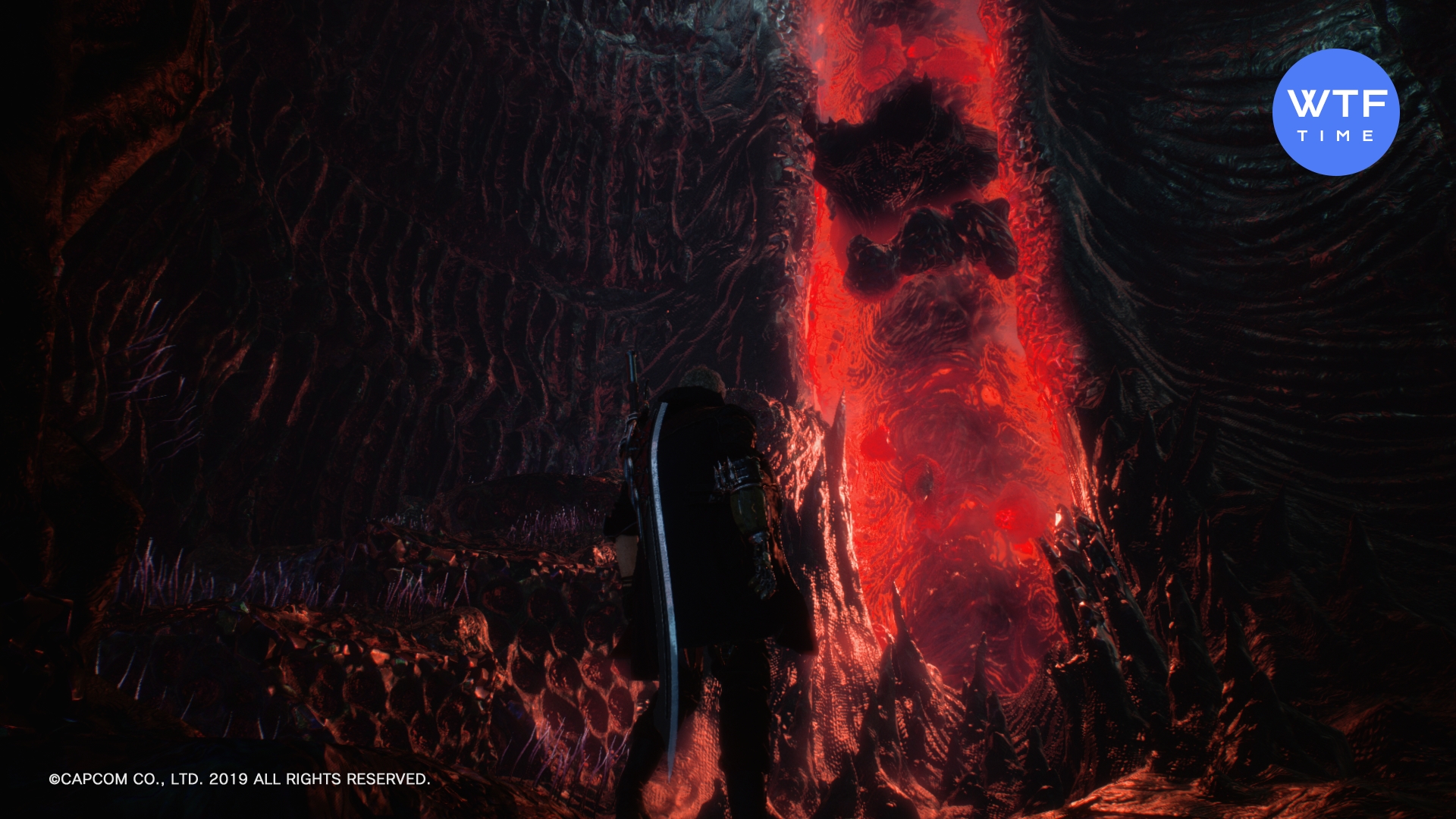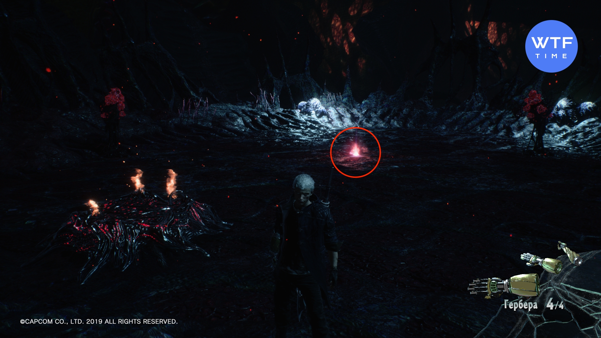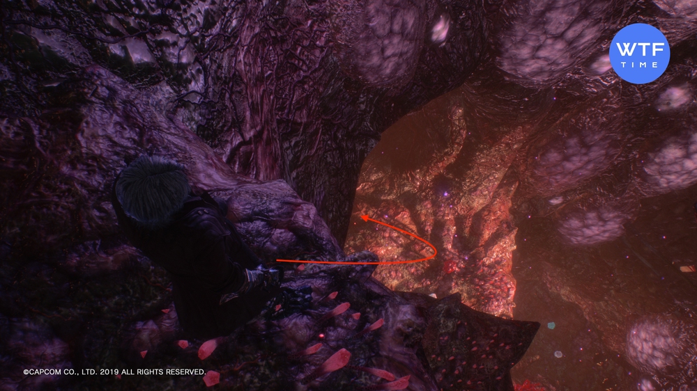 Миссия 08. Владыка демонов. Двигайтесь по сюжету, пока не доберетесь до второго потока лавы на уровне. Используйте его в качестве лифта и примерно на середине подъема спрыгните вправо на площадку с травой. Отсюда Неро сможет сможет использовать две точки захвата, чтобы перебраться на следующую платформу. Внизу вы увидите два красных кристалла, точка входа в секретную миссию расположена между ними.