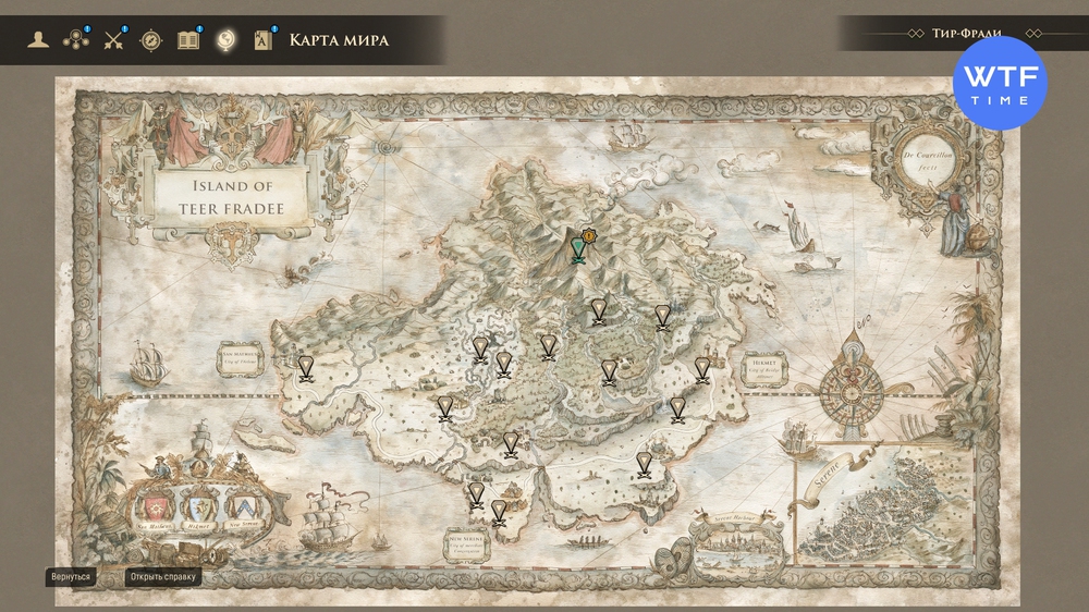 Карта мира в GreedFall состоит из 15 отдельных регионов. Все они откроются вам по мере продвижения по сюжету. Если в какую-то часть региона пройти нельзя, значит она связана с квестом. Чтобы открыть все, не забывайте про дополнительные задания спутников и фракций.