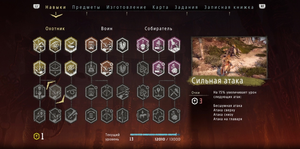 Но как понять, какие нужнее? Ведь очки для их разблокировки не падают нам с неба. Об этом и будет наш гайд. На скрине ниже видно, что все навыки в Horizon Zero Dawn разделены на 3 группы: охотник, воин и собиратель. Вся прелесть в том, что вам не обязательно специализироваться на какой-то одной ветке, можно выедать самое полезное из каждой. Так давайте поговорим о них подробнее.