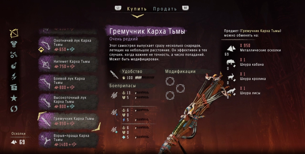 Стоимость: 950 металлических осколков, 1 шкура кабана, 1 шкура кролика и 1 шкура лисы.