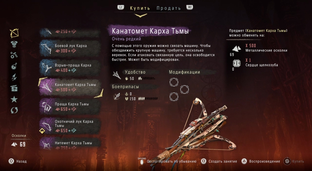 Описание: это оружие не наносит урона само по себе, зато позволяет вам связывать противников. В сочетании с умением Критическое попадание может стать весьма полезным подспорьем в бою. Чем больше ваш противник, тем больше канатов вам потребуется, чтобы его связать. Тут все логично. В принципе, можно вообще не покупать это оружие. Но если уж оно присутствует в вашем арсенале, полезно будет иметь самую лучшую версию. От предыдущих она отличается количеством слотов для модификации.
