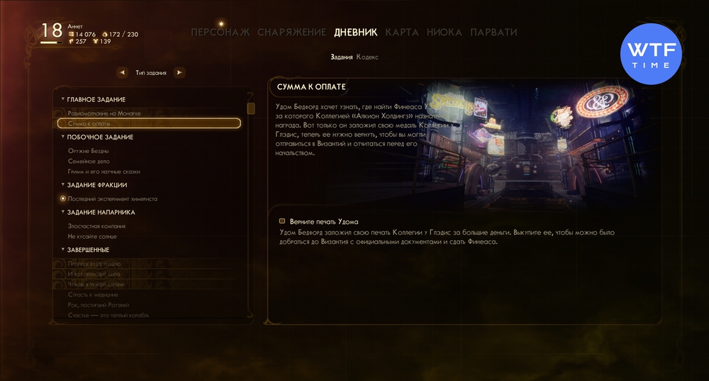 Так вы получите задание "Сумма к оплате". Теперь отправляйтесь к Глэдис и выкупите печать коллегии за 8000 бит. Верните её Бедфорду и он даст вам навиключ для путешествия в Византию.