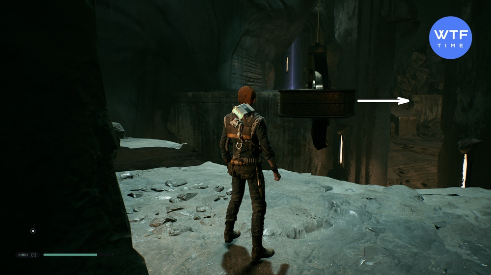 - Сфера 3 - эта сфера висит в соседнем зале, мы качались на ней по пути сюда. От точки медитации пробежите по стене и окажетесь прямо возле неё. Чтобы опустить сферу вниз, нужно раскачать её, а затем ударить Толчком силы в направлении разрушаемого прохода. Сфера упадет, так что вы сможете вытолкнуть её в наш зал.