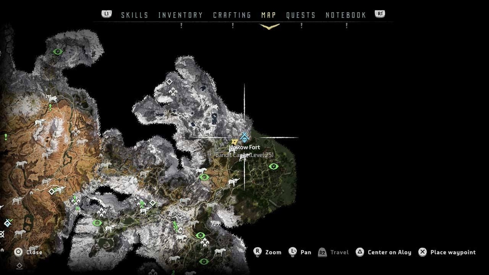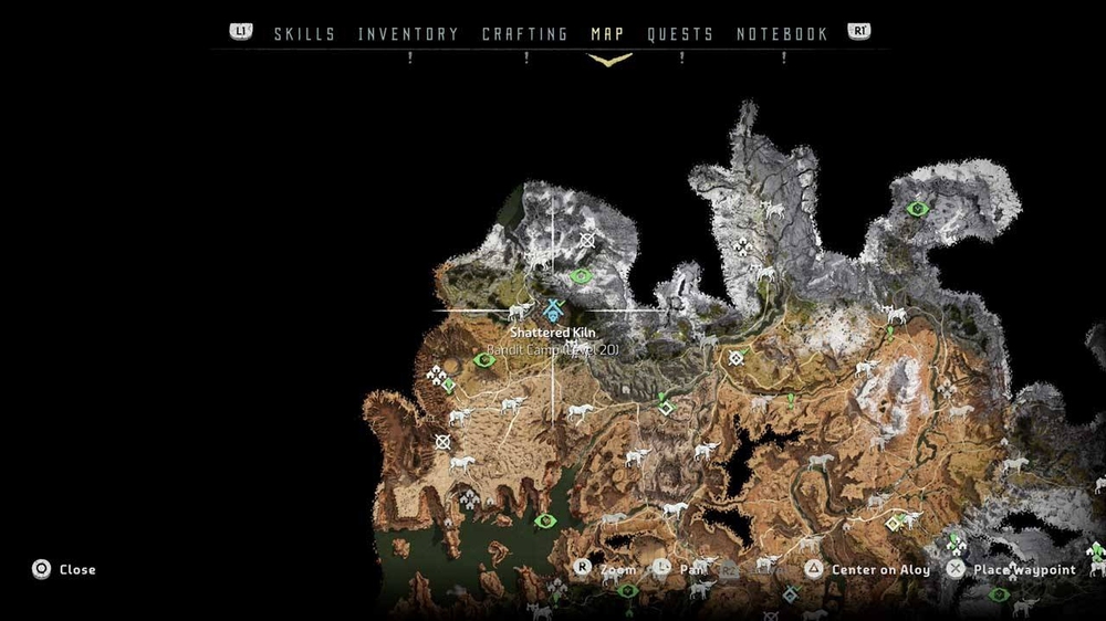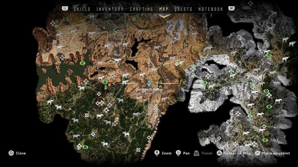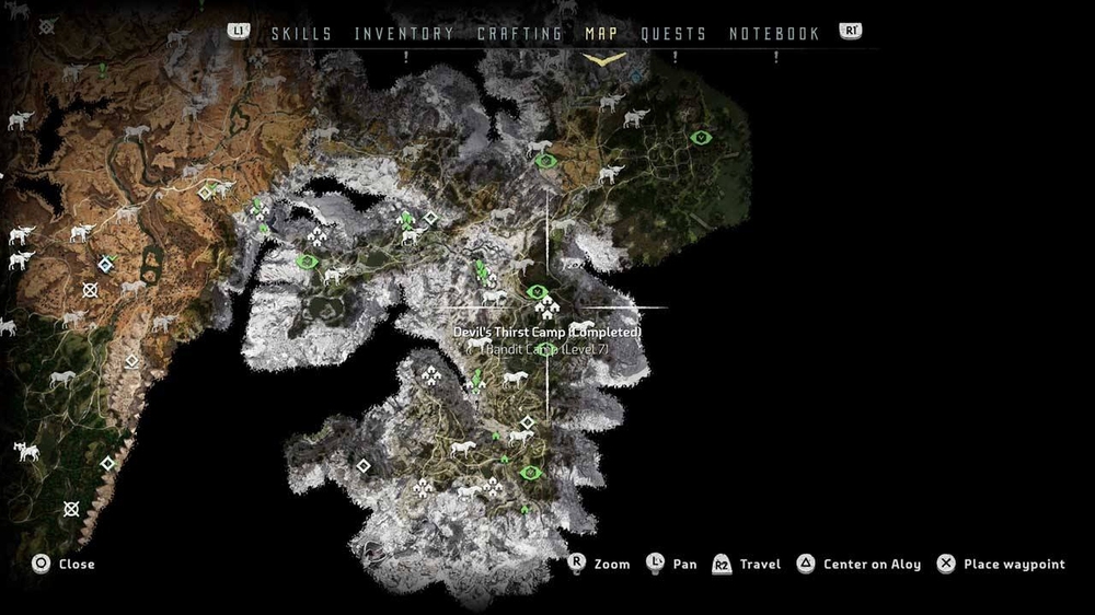 Всего в Horizon Zero Dawn 6 лагерей разбойников. По сути это мирные поселения, которые были захвачены не очень мирными людьми. За их освобождение вы получите опыт и награду. На карте они обозначаются голубым значком черепа под крышей и открываются, если пройти рядом или залезть на длинношея. Зачистив их все, можно заработать ачивку и дополнительную миссию.