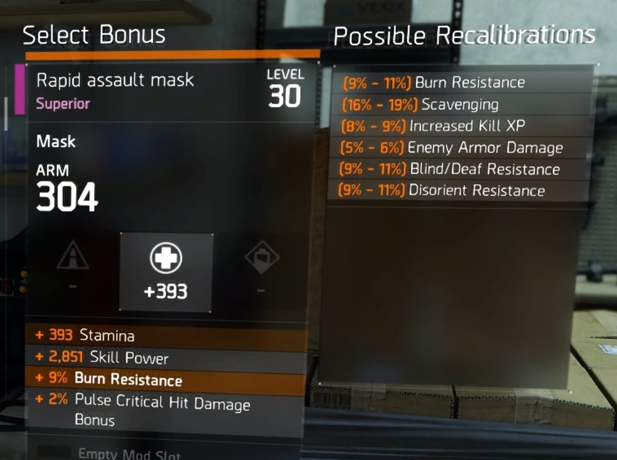 Всё верно - некоторые предметы можно перекалибровывать так, чтобы они давали бонус к Сбору ресурсов. Вам придется сделать себе отдельный набор снаряжения, заточенный специально под увеличение Сбора ресурсов, но оно того стоит - 30-40% Сбора превратятся в 100 и выше.