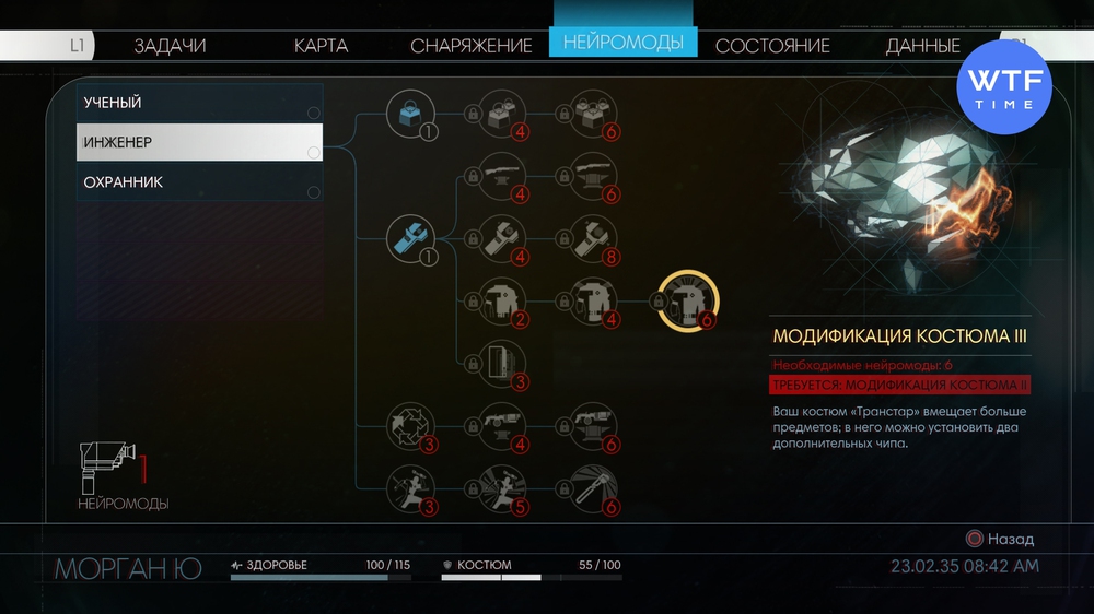 В продолжение темы было бы неплохо узнать, как нам расширить свой инвентарь. Начинаем мы с вами с 45 слотами, но очень скоро нам захочется иметь больше. Увы, для этого придется потратить очень ценные ресурсы - нейромоды. Расширение инвентаря - это одна из абилок Морган, которая прокачивается наравне с другими способностями. Найти её можно в разделе Инженер под названием Модификация костюма. Первое обновление увеличит ваш инвентарь до 60 слотов, второе до 77, третье до 96.