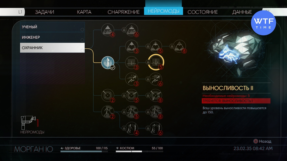 Следующий логичный вопрос, который возникнет у вас после знакомства с ключом: "Как повысить выносливость?". Тут нам снова помогут нейромоды. Идем в раздел Охранник и ищем там навык Выносливость. Кстати, здоровье прокачивается здесь же. Абилка называется Стойкость.