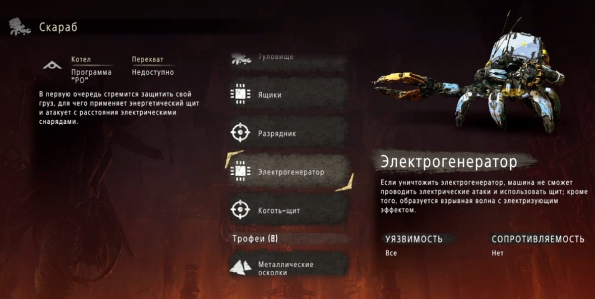 В этом случае Скараб лишится не только щита,, но и возможности проводить электрическую атаку. Вырубить генератор непросто, он находится в нижней части робота. Очевидный способ: с помощью Нитемета установить ловушку и заманить робота на нее. При достаточной доле везения одной ловушки хватит, чтобы уничтожить генератор.