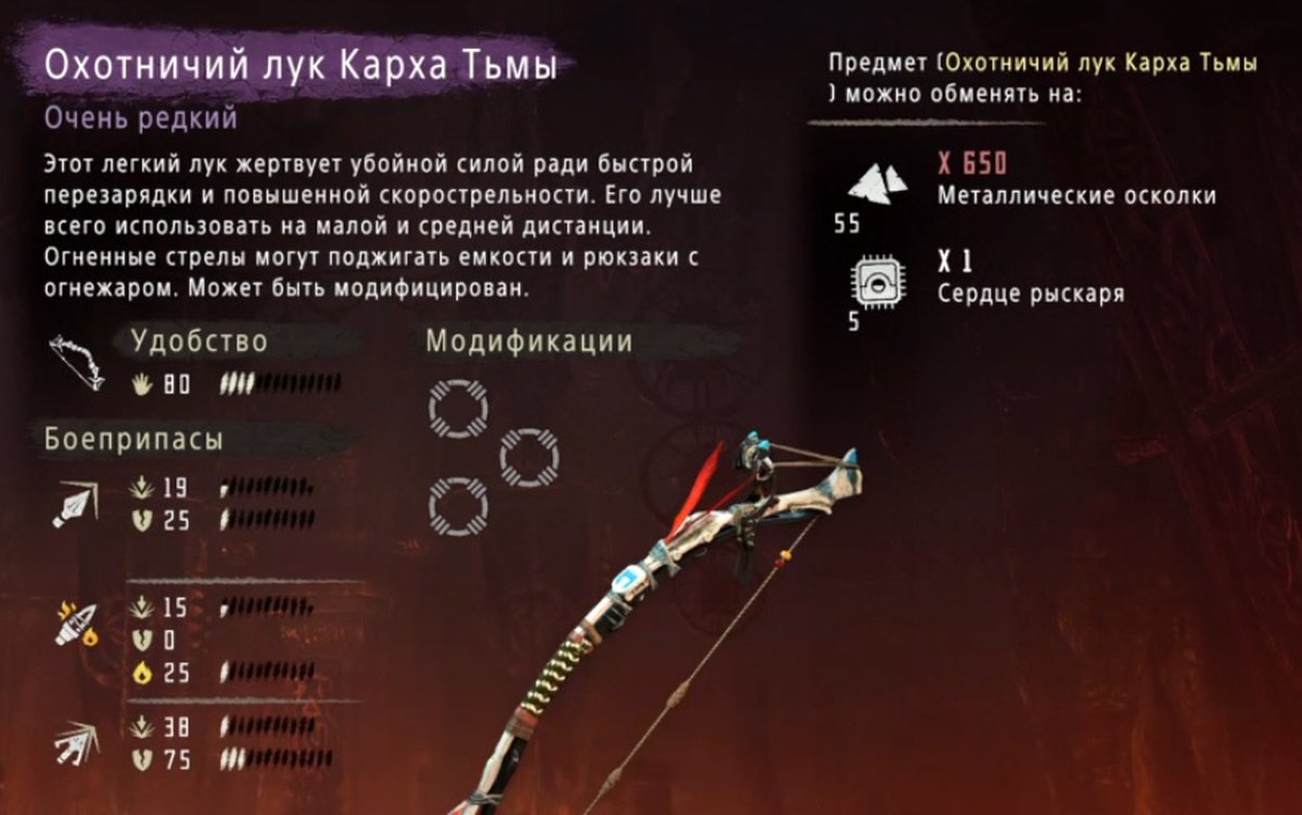 Боевой лук Карха Тьмы обойдется вам в одно сердце Бизона и 800 металлических осколков.