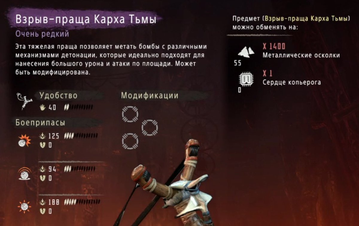 Взрыв-праща Карха Тьмы обойдется вам в одно сердце Копьерога и 1400 металлических осколков.