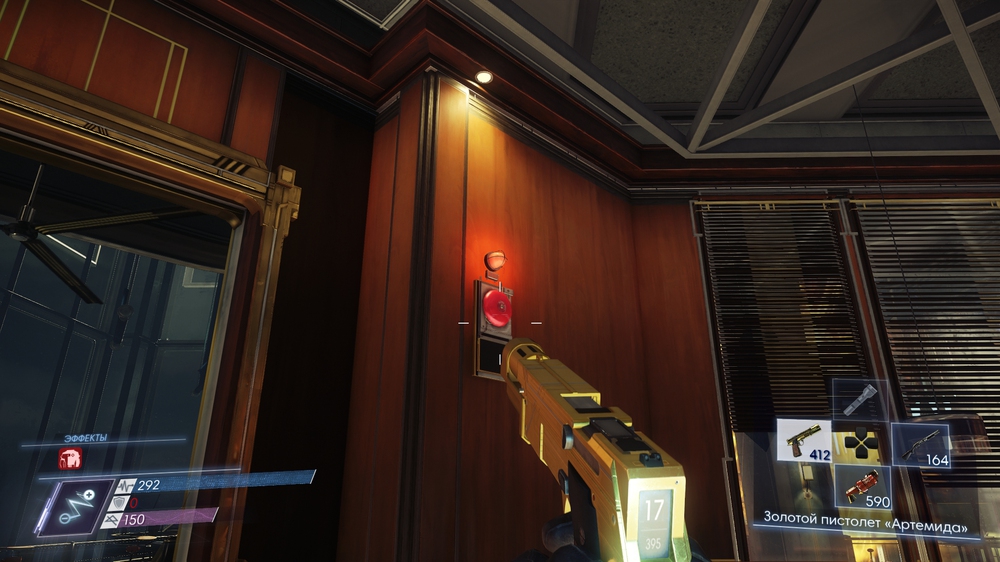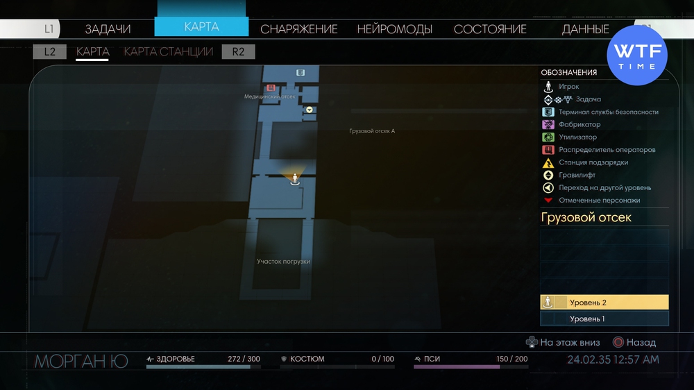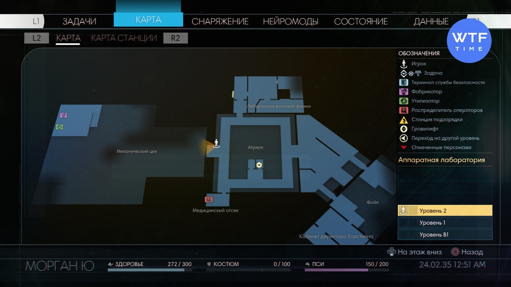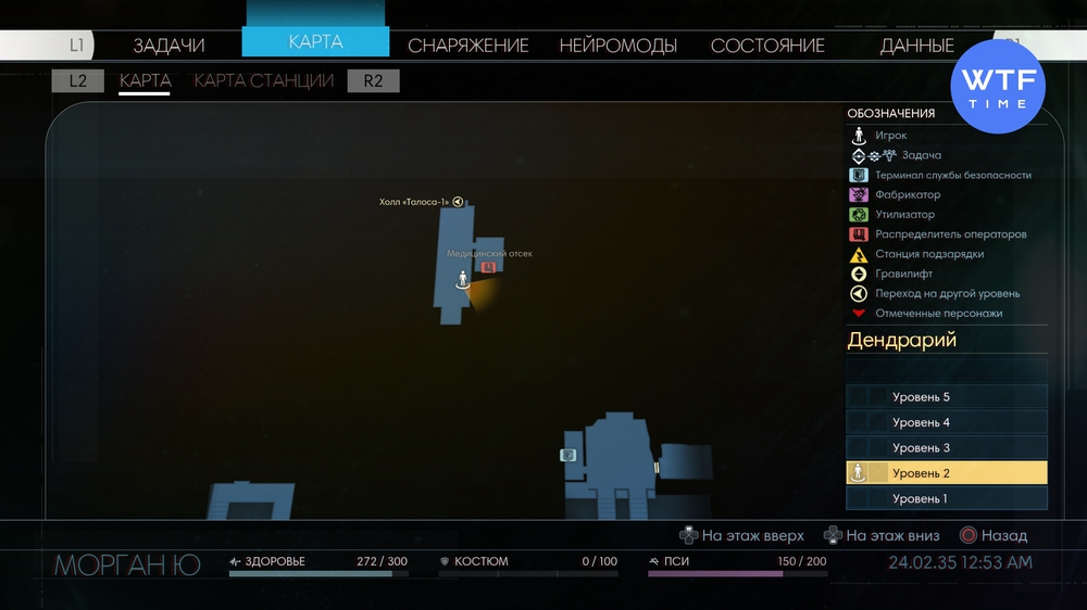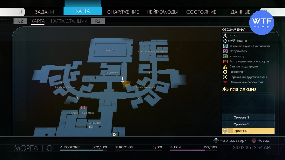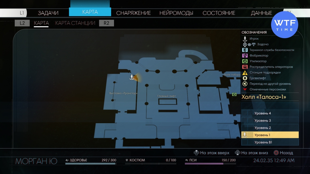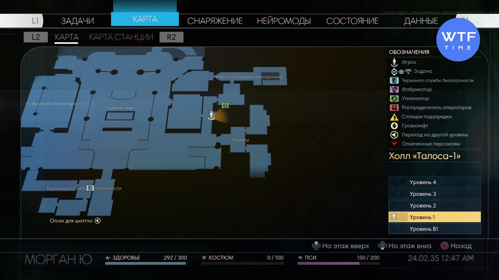 - Четвертый тайник (3:03) - и снова нам в холл, далеко ходить не придется. Отправляйтесь в комнату с названием Выставка "Транстар" на первом уровне. Это слева от главного лифта, если смотреть по карте. Сейф висит на стенке слева от входа.