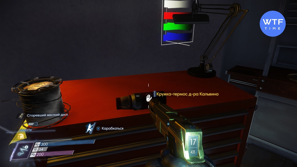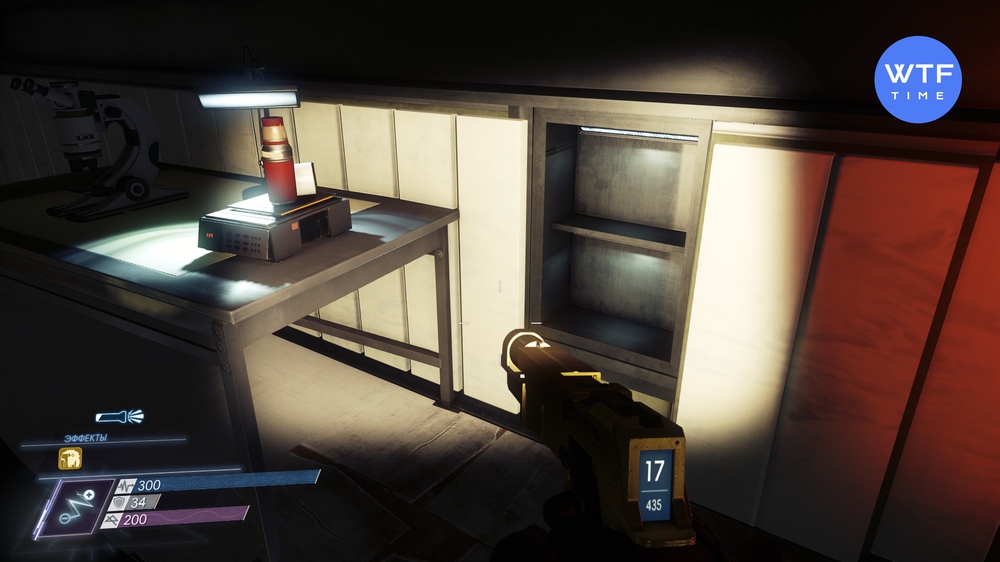 Теперь отыщите стол с весами и микроскопом на нем. Он стоит прямо напротив входа в лабораторию. Положите кружку на весы и наблюдайте, как справа от стола откроется тайник. Внутри лежат два нейромода и пропуск от каюты доктора Кальвино.