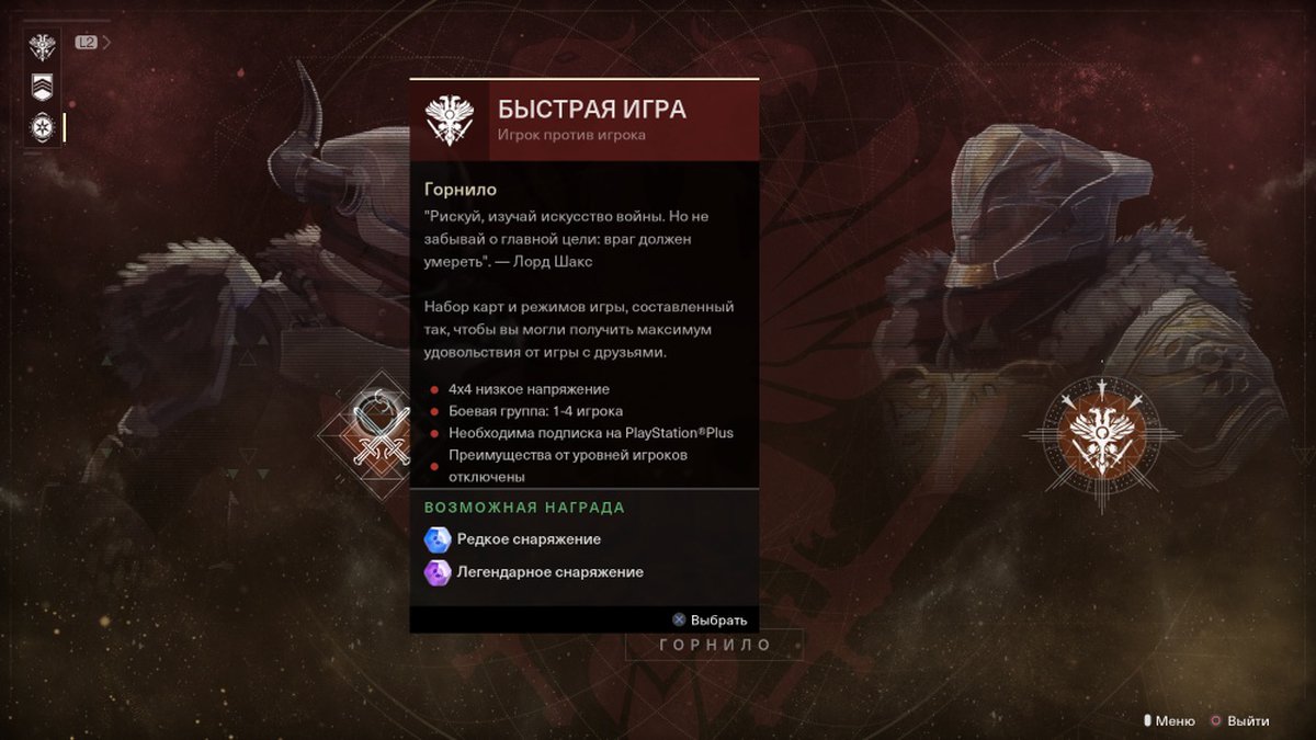 PvP в Горниле: первое из мультиплеерных развлечений вне основного мира Destiny 2. Арены Горнила станут отличной проверкой ваших рефлексов на прочность: уже сейчас в PvP регулярно встречаются слаженные клановые команды, готовые устроить веселую жизнь обычным игрокам. Перед походом в Горнило нужно побеседовать с Лордом Шаксом - сделать это можно сразу после первого появления на Ферме.