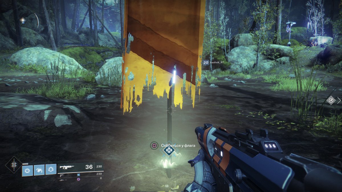 Открытые мероприятия обозначаются на карте характерным значком, а в игровом мире на месте еще не стартовавшего мероприятия стоит потертый флаг. Флаг полезен: если "собраться" около него, то у вашего Стража восстановится запас патронов и откатится Суперзаряд. Отличная возможность пополнить боезапас перед началом мероприятия или просто восстановить Суперзаряд, если вы проходите мимо.