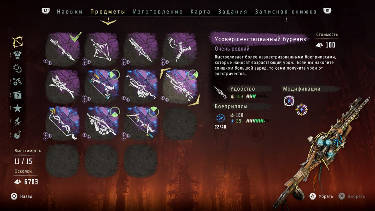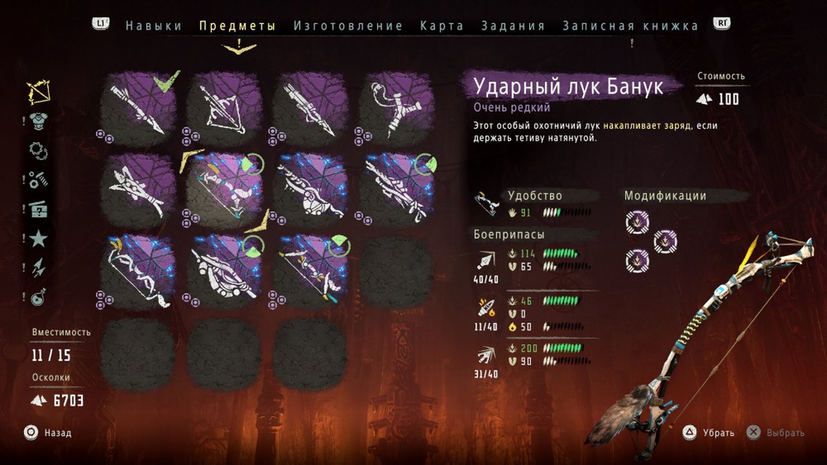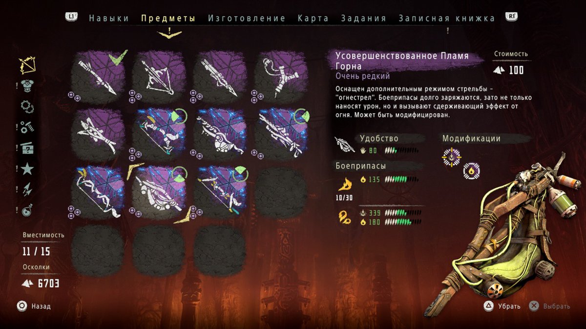 Найденное оружие стоит улучшить. В The Frozen Wilds этим занимается Варга из Длинной Засечки - вы познакомитесь с местной мастерицей во время прохождения основной сюжетной линии дополнения. Для Элой Варга работает бесплатно: чтобы превратить Пламя Горна в Усовершенствованное Пламя Горна вам нужно подстрелить несколько Бурдюков и принести ей недостающие детали.