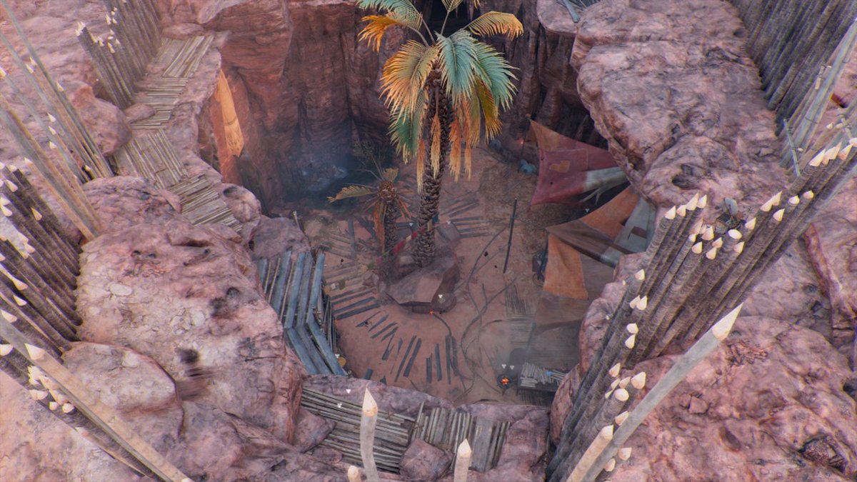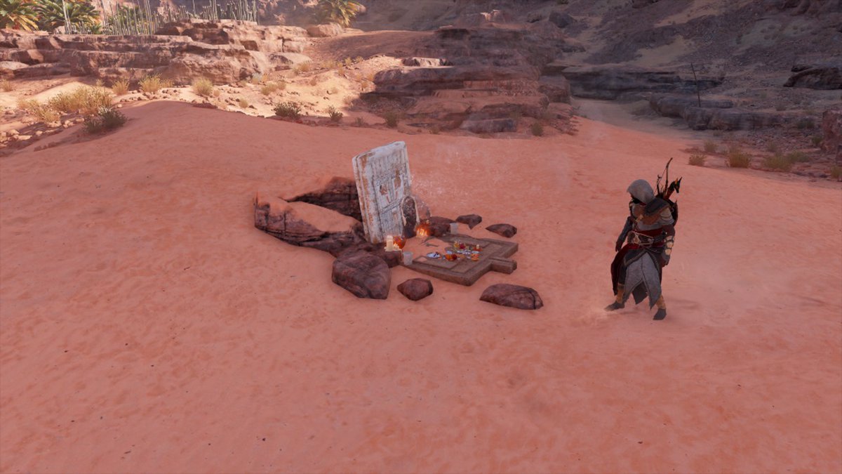 После прибытия в пустыню отыщите труп верблюда, лежащий в луже крови — Байек прозорливо отметит, что здесь произошло сражение — и следуйте по кровавым следам, пока не упретесь в захоронение. Нескольких человек закопали в песок заживо — точно так же, как делал Скарабей. У Тахарки появились последователи?