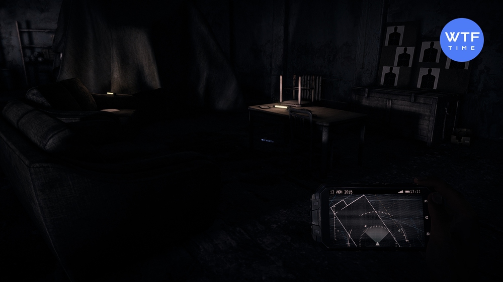 - Дальше достаем пистолет и шустренько зачищаем локацию. Без этого нам просто негде будет развернуться. На столе в центре комнаты забираем две чертежа и фото.