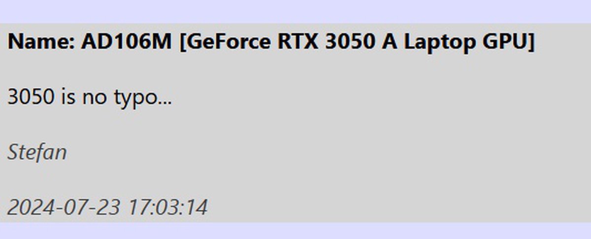 Предполагается, что новую мобильную версию GeForce RTX 3050 построят на основе чипа AD106. Литерой AD обозначается архитектура Ada, использующаяся в видеокартах GeForce RTX 40, у архитектуры Ampere используется обозначение GA.