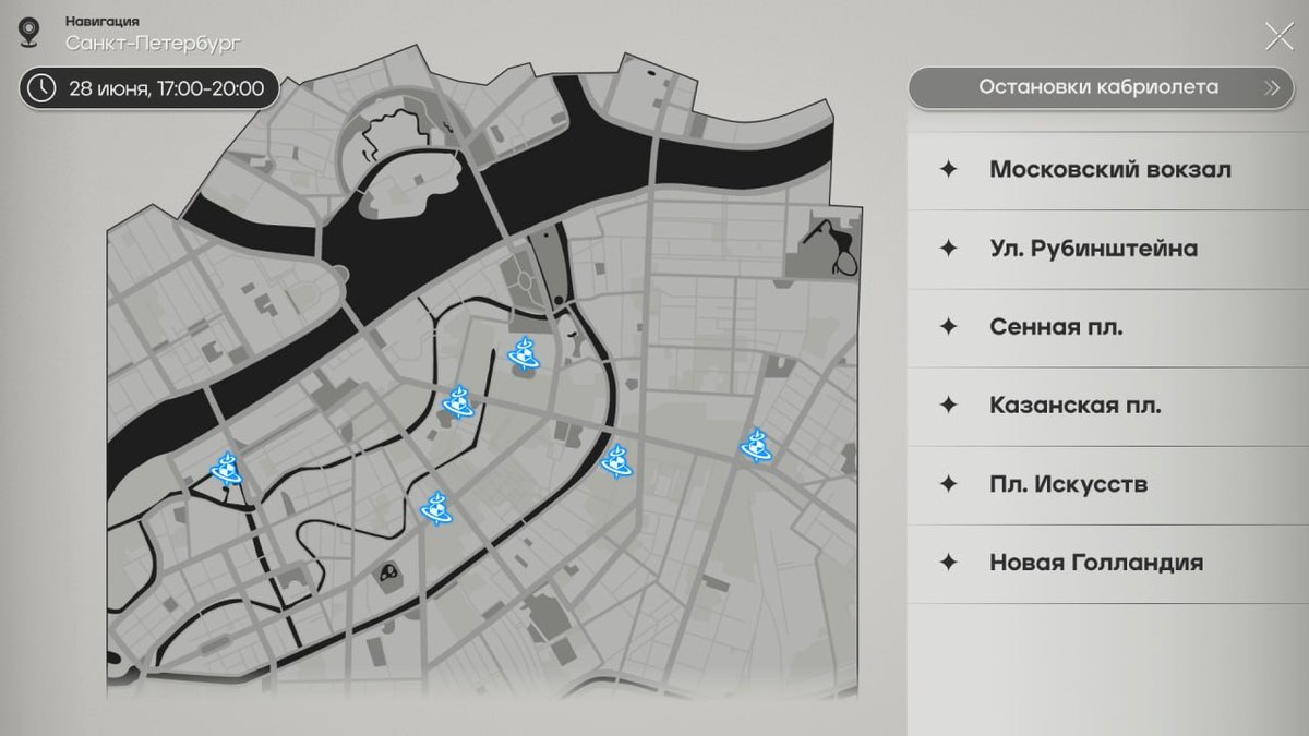 Всего планируется 6 остановок: на площади Восстания, на улице Рубинштейна, на Сенной площади, у Казанского собора, на площади Искусств и в Новой Голландии. Места остановок отмечены на карте события, точное время остановок раскроют позднее.