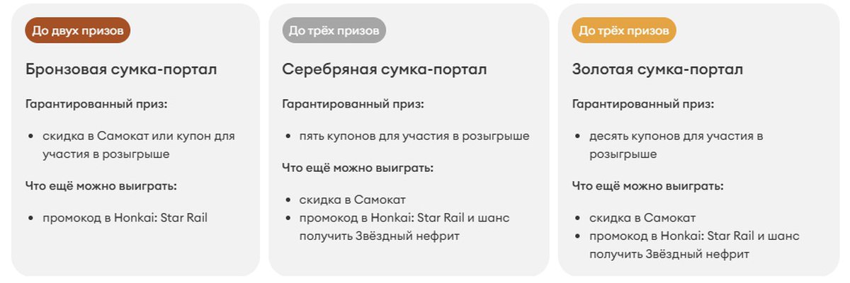 Для участия в коллаборации придется зарегистрироваться по номеру телефона, используемом в «Самокате». Затем игрокам нужно выполнять особые задания, получая разнообразные подарки из сумок-порталов: например, промокоды для Honkai Star Rail или самого «Самоката».